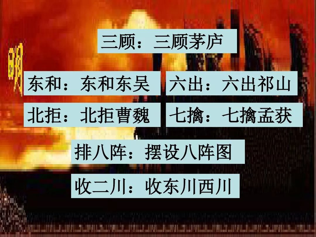 空城计、七擒孟获、草船借箭、舌战群儒、摆八封阵、三气周瑜