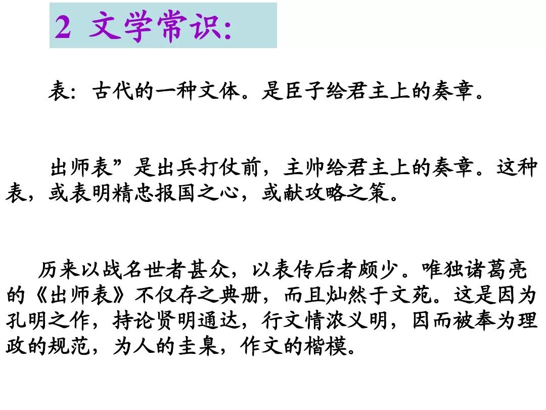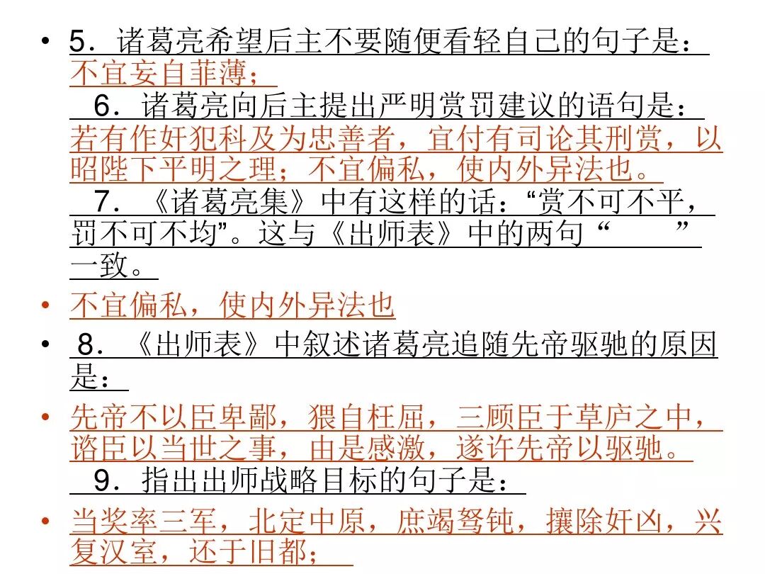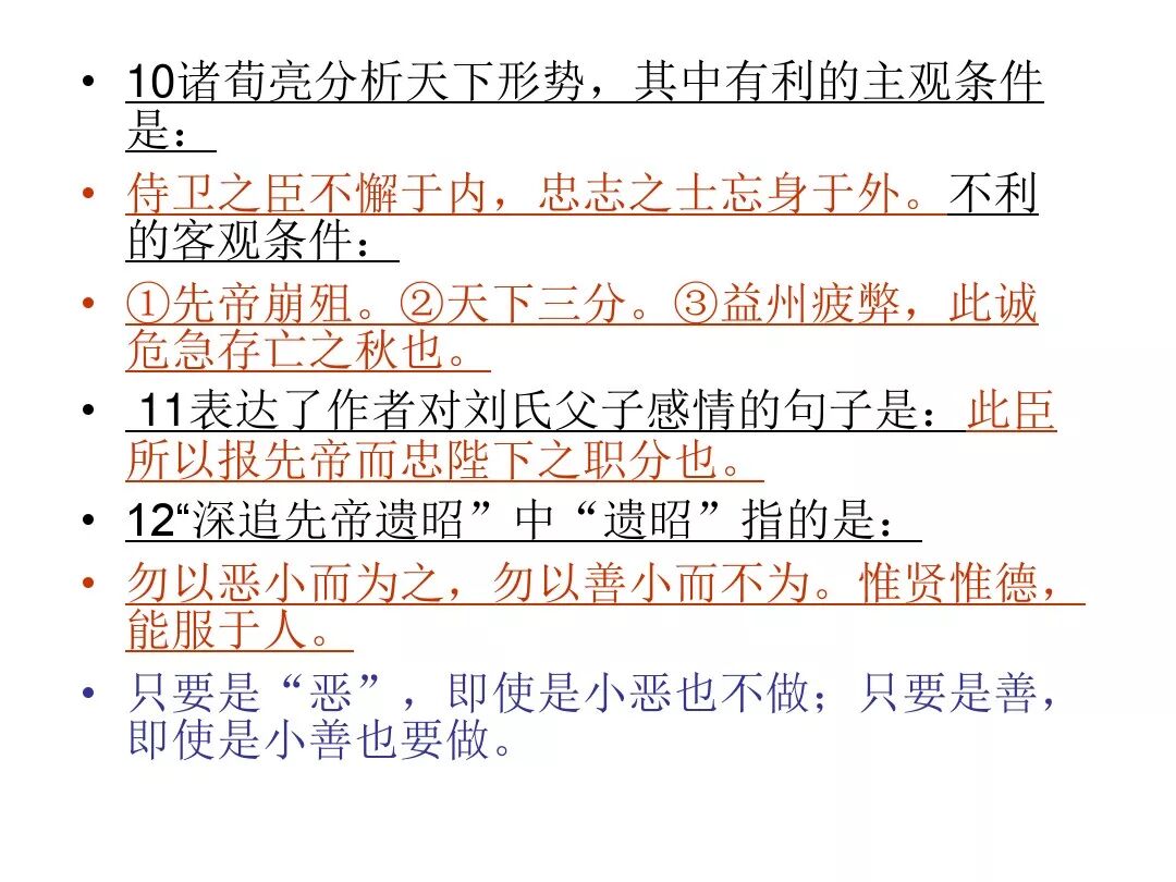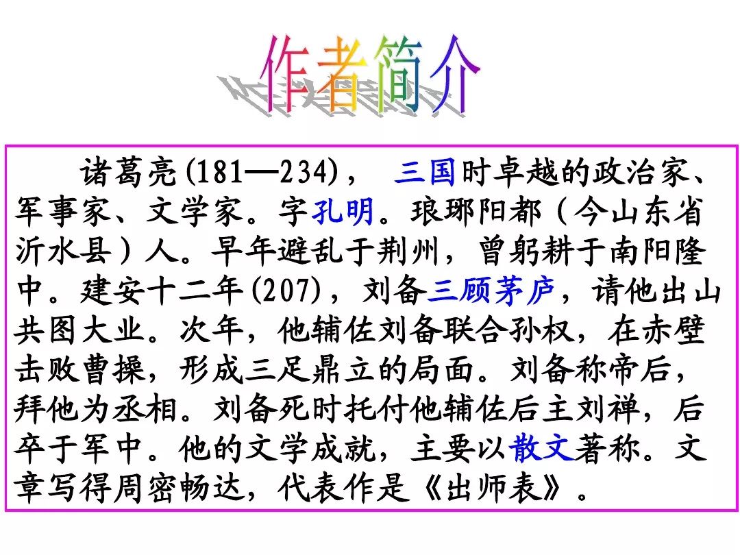 7、本文的名句:①勿以恶小而为之,勿以善小而不为。②受任于败军之际,奉命于危难之间。③静以修身,俭以养德。④非宁静无以致远 非淡泊无以明志⑤鞠躬尽瘁 死而后已。