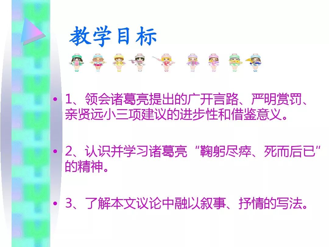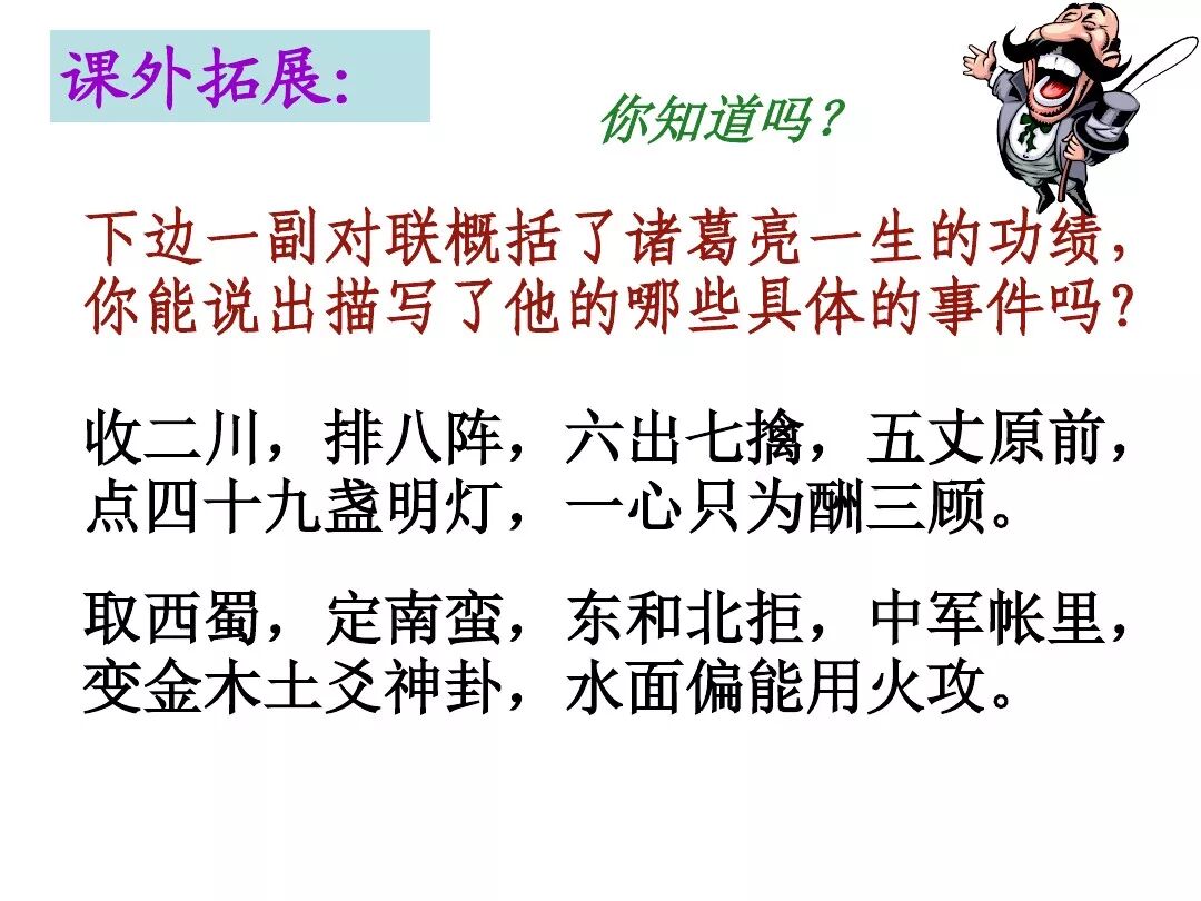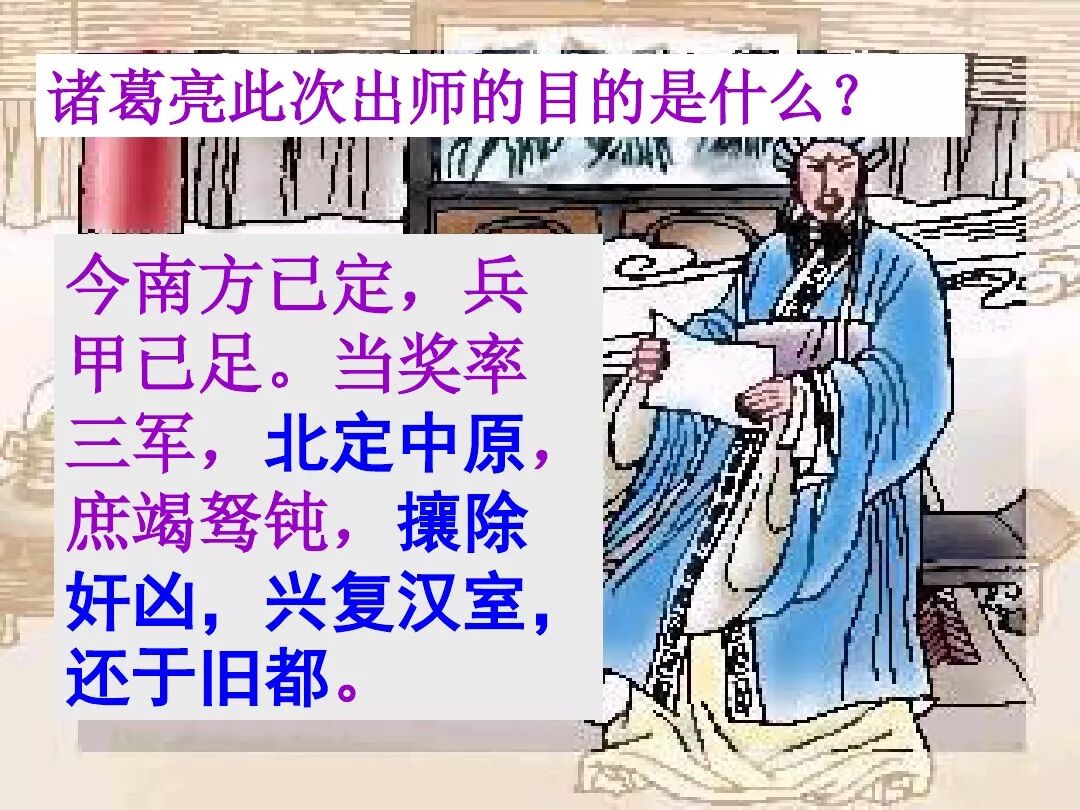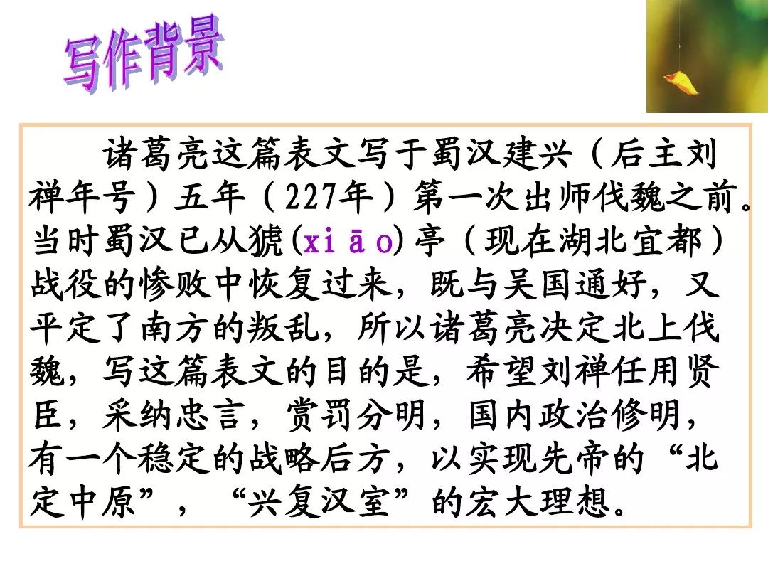 7、本文的名句:①勿以恶小而为之,勿以善小而不为。②受任于败军之际,奉命于危难之间。③静以修身,俭以养德。④非宁静无以致远 非淡泊无以明志⑤鞠躬尽瘁 死而后已。