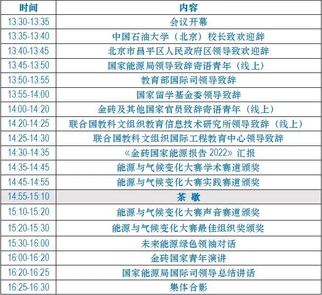 想与国际能源青年交流吗? 想与未来能源绿色领袖对话吗? 想了解未来能源发展趋势吗? 快收下这封邀请函! // 金砖国家合作至今已经走过16年的光辉历程,发展成为全方位、多层次、宽领域的国际合作机制。2022年中国担任金砖国家主席国。在金砖国家领导人第十四次会晤上,五国领导人一致认为,金砖国家应该加强团结,发扬金砖精神;加强科技创新、能源安全等领域合作,合力推动世界经济复苏;携手应对气候变化挑战,加快落实联合国2030年可持续发展议程,为共创全球发展新时代作出金砖贡献。会晤通过并发表的《金砖国家领导人第十四次会晤北京宣言》表示“赞赏举办金砖国家青年能源峰会”。 能源合作是金砖合作的重要组成部分。今年9月,国家能源局将主办第七届金砖国家能源部长会议。青年尤其是能源领域青年,在推动全球能源绿色低碳转型、应对气候变化和落实联合国2030年可持续发展议程中肩负着伟大历史使命。为促进“金砖+”能源青年之间的交流,倡导各方关注能源青年的声音主张和未来发展,为落实联合国2030年可持续发展议程凝聚智慧力量,中国石油大学(北京)将举办金砖国家能源青年峰会暨国际能源青年大会。会议同时也是2022全球能源转型高层论坛的分论坛之一。 会议主题: 青年团结创新,拥抱能源绿色未来 会议时间: 2022年9月18日13:30 会议地点: 北京未来科学城中海油大厦会议厅 会议组织机构: 支持单位: 中华人民共和国国家能源局 主办单位: 中国石油大学(北京) 北京市昌平区人民政府 世界能源大学联盟 协办单位: 中国石油国际勘探开发有限公司 中国石化集团国际石油勘探开发有限公司 中国海洋石油国际有限公司 联合国教科文组织教育信息技术研究所 联合国教科文组织国际工程教育中心 会议形式: 线上线下结合 (线上直播平台二维码附后) 工作语言: 中文、英文 会议议程: 线上直播平台 微信官方视频号 抖音官方直播间 英文直播间 共话能源转型和青年发展 凝心聚力 携手构建人类命运共同体 开创绿色美好未来! 点击文末阅读原文即可报名哦! 来源:国际合作与交流处 编辑:魏志博 责任编辑:华南 审核:李丽平 刘志庆 第一堂专业启蒙课,院士开讲!(文末新机遇,新生关注!) 速看!中石大2023年招收攻读硕士研究生简章来了! 结训名场面!红旗卷,浩气扬,意纵横! 中石大喜报!杰青+1,优青+4! 这一刻,我们同心守护! 快来一起畅谈能源!![]()