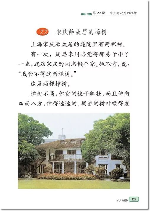 《宋庆龄故居的樟树》是一篇以物喻人的叙事性文章。文章具体描写了宋庆龄故居的两棵樟树的外形和生长特点,以及它具有拒虫的香气且能永久保持的可贵之处。文章既表达出作者对这两棵樟树的赞美之情,又在字里行间渗透着作者对宋庆龄的深深怀念之情。