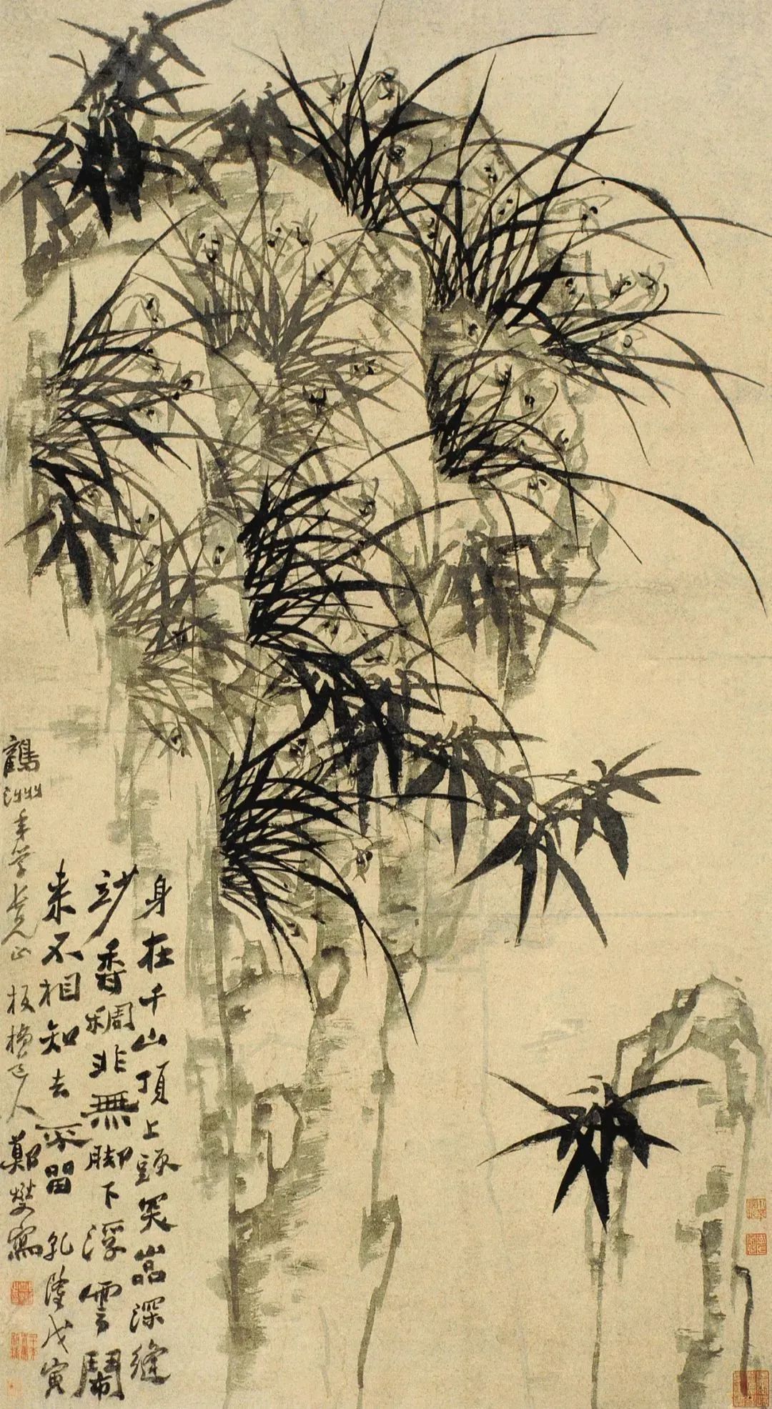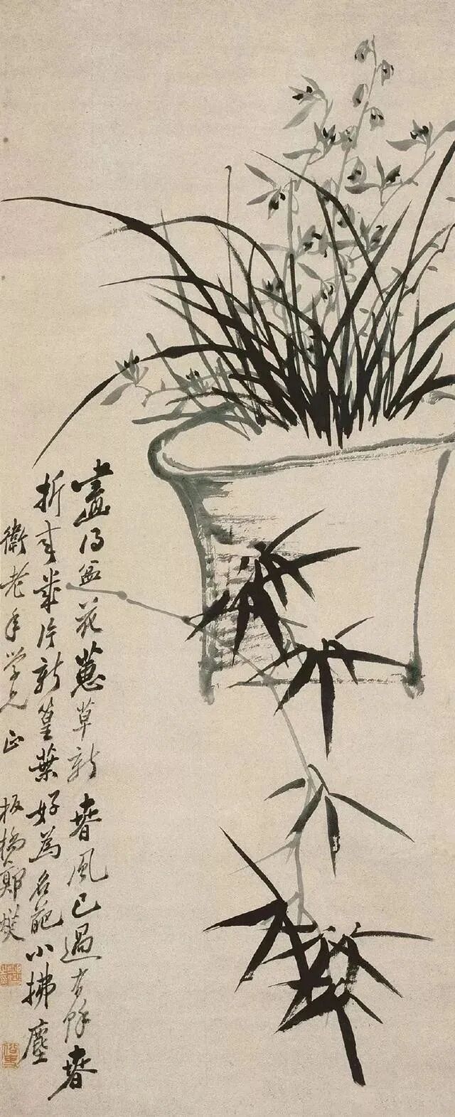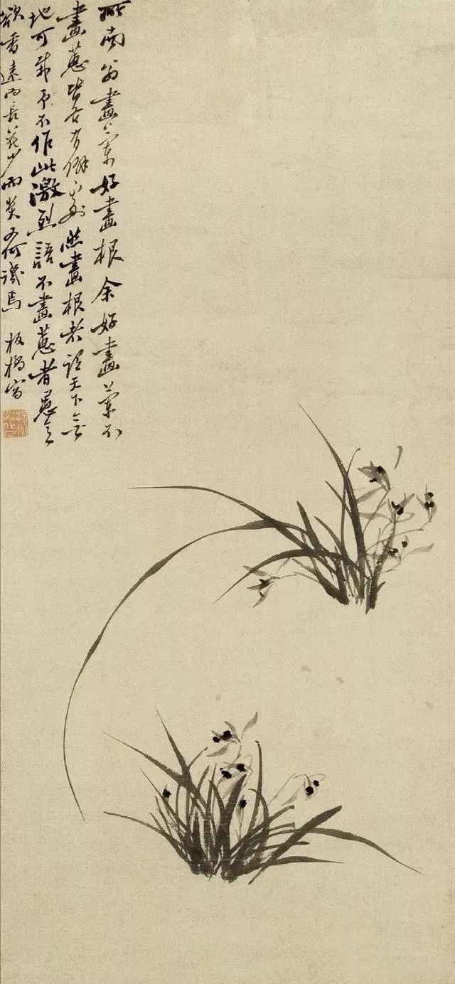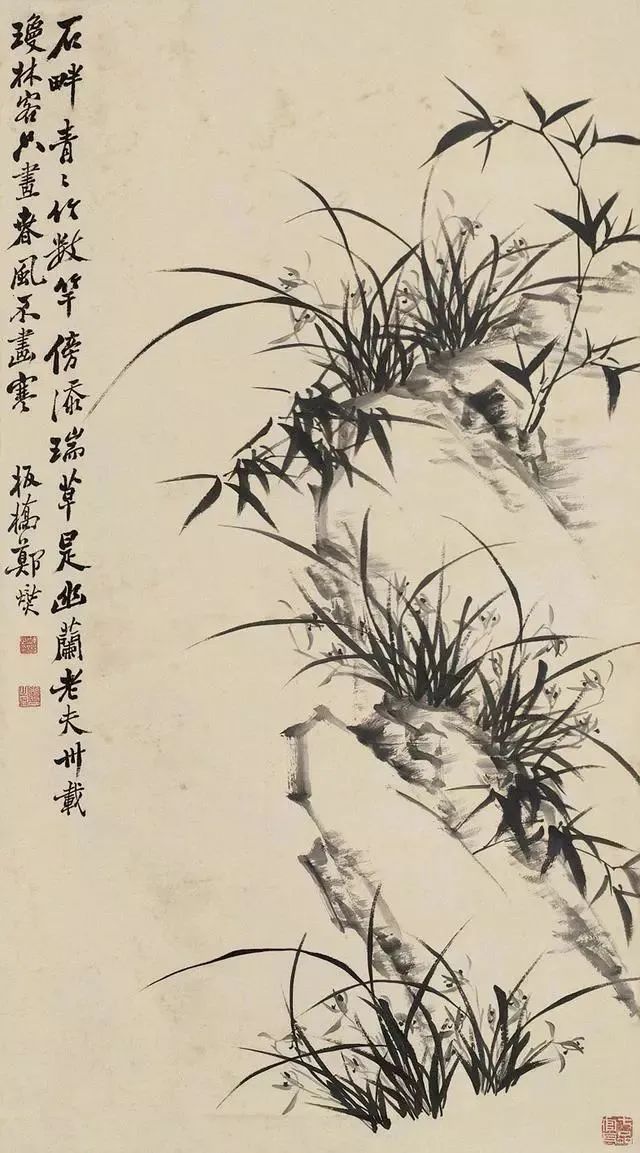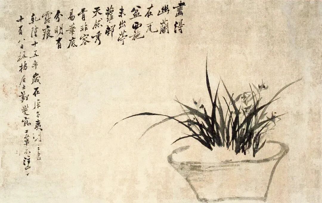 上面这幅作品画有三丛兰花,浓墨写就兰叶,俊逸多姿;淡墨勾出兰花,清雅可人,花心用浓墨点出,般配着左下角的题诗:素心兰与赤心兰,总把芳心与客看。岂是春风能酿得,曾经霜雪十分寒。兰花的芳心,就在这一刻散发出幽香。