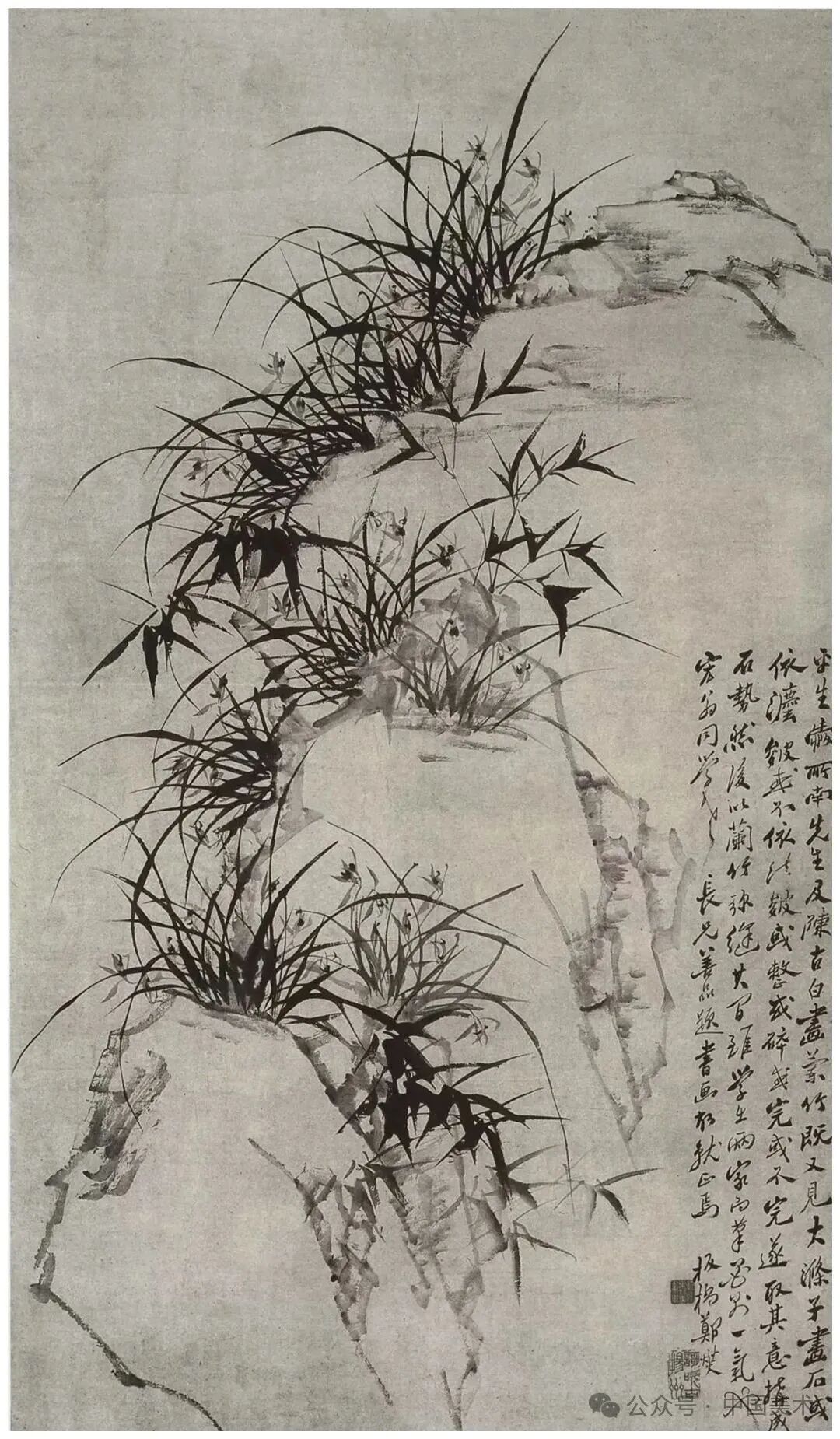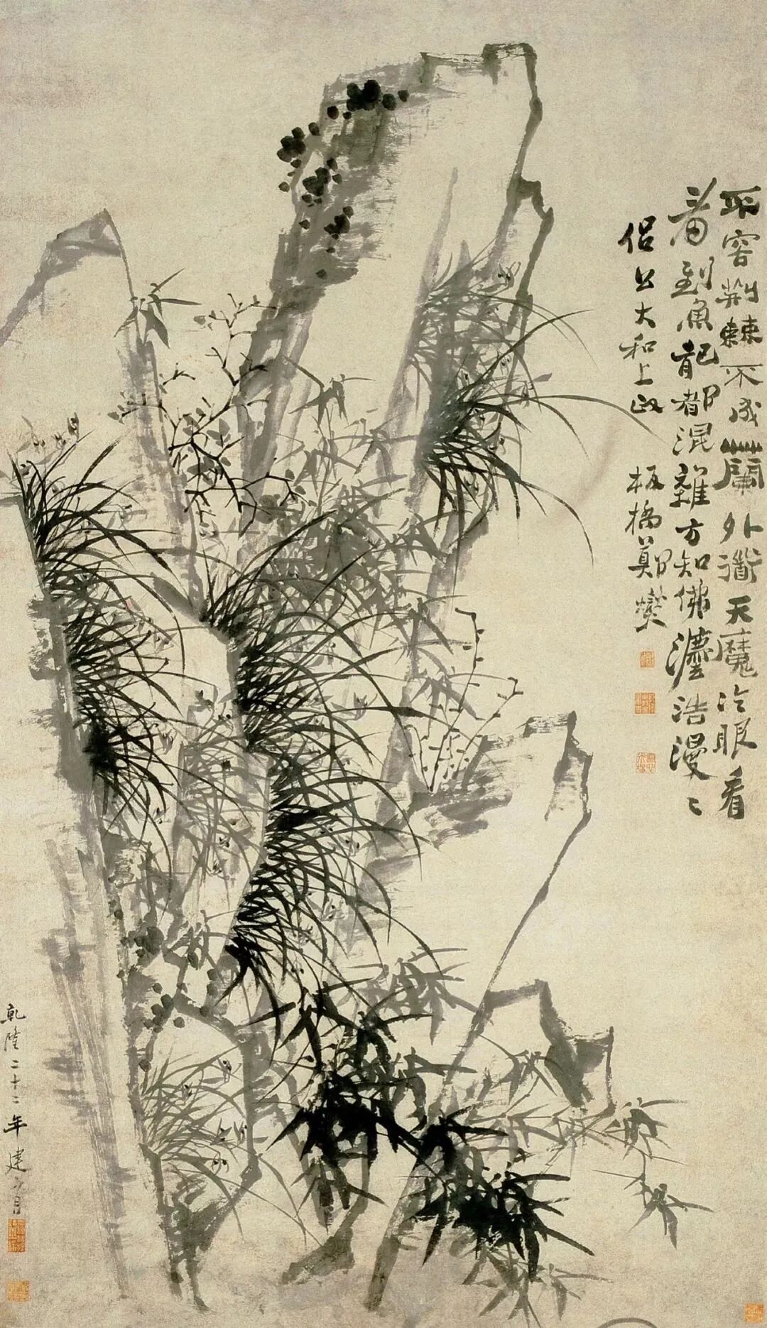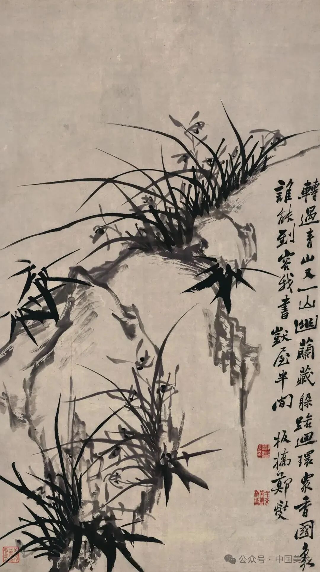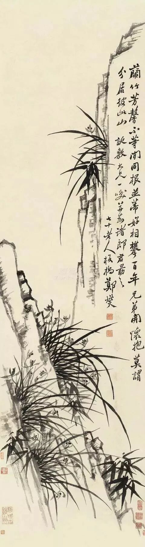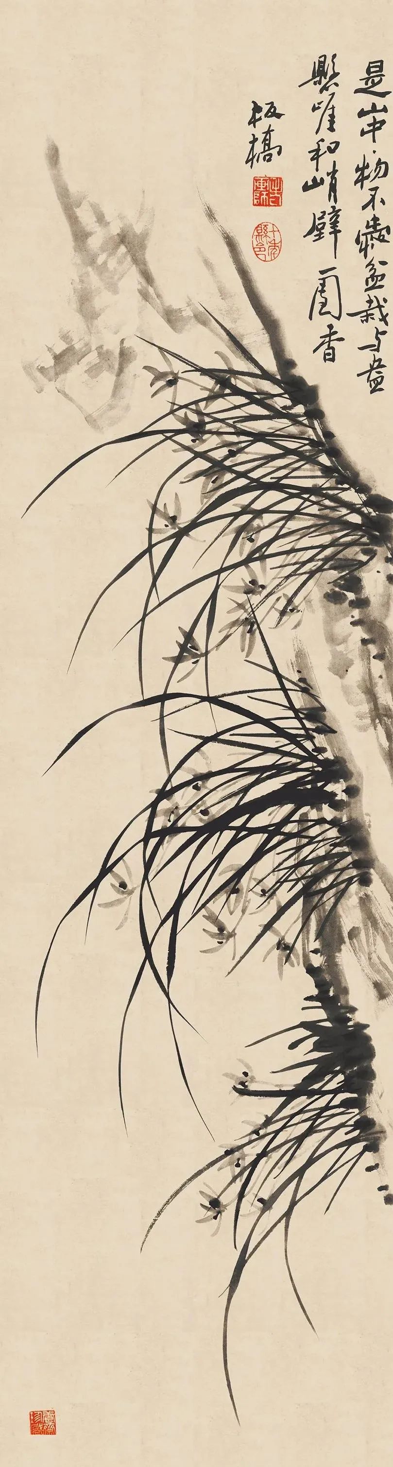 上面这幅作品画有三丛兰花,浓墨写就兰叶,俊逸多姿;淡墨勾出兰花,清雅可人,花心用浓墨点出,般配着左下角的题诗:素心兰与赤心兰,总把芳心与客看。岂是春风能酿得,曾经霜雪十分寒。兰花的芳心,就在这一刻散发出幽香。