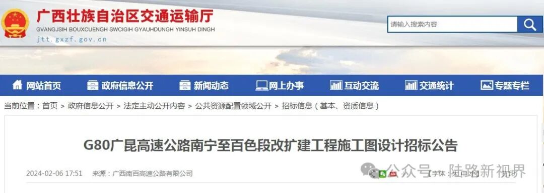 G80广昆高速南宁至百色段改扩建工程项目已由广西发改委以《广西壮族自治区发展和改革委员会关于G80广昆高速公路南宁至百色段改扩建工程(坛洛至百色段)项目核准的批复》(桂发改交通〔2023〕1154号)、《广西壮族自治区发展和改革委员会关于G80广昆高速公路南宁至百色段改扩建工程(南宁至坛洛段)项目核准的批复》(桂发改交通〔2023〕1155号)批准建设。项目投资人为广西交通投资集团及广西坛百高速公路有限公司,建设资金来自业主自筹及银行贷款。