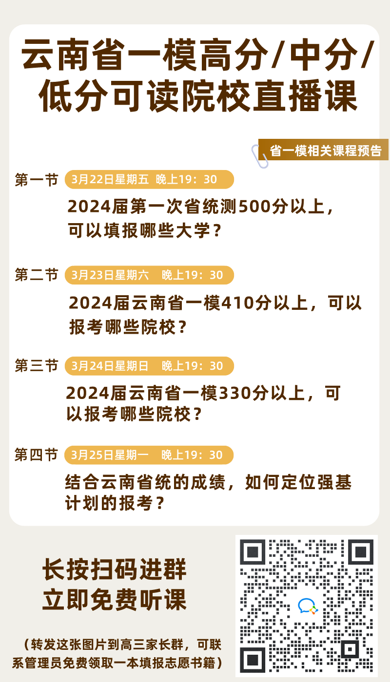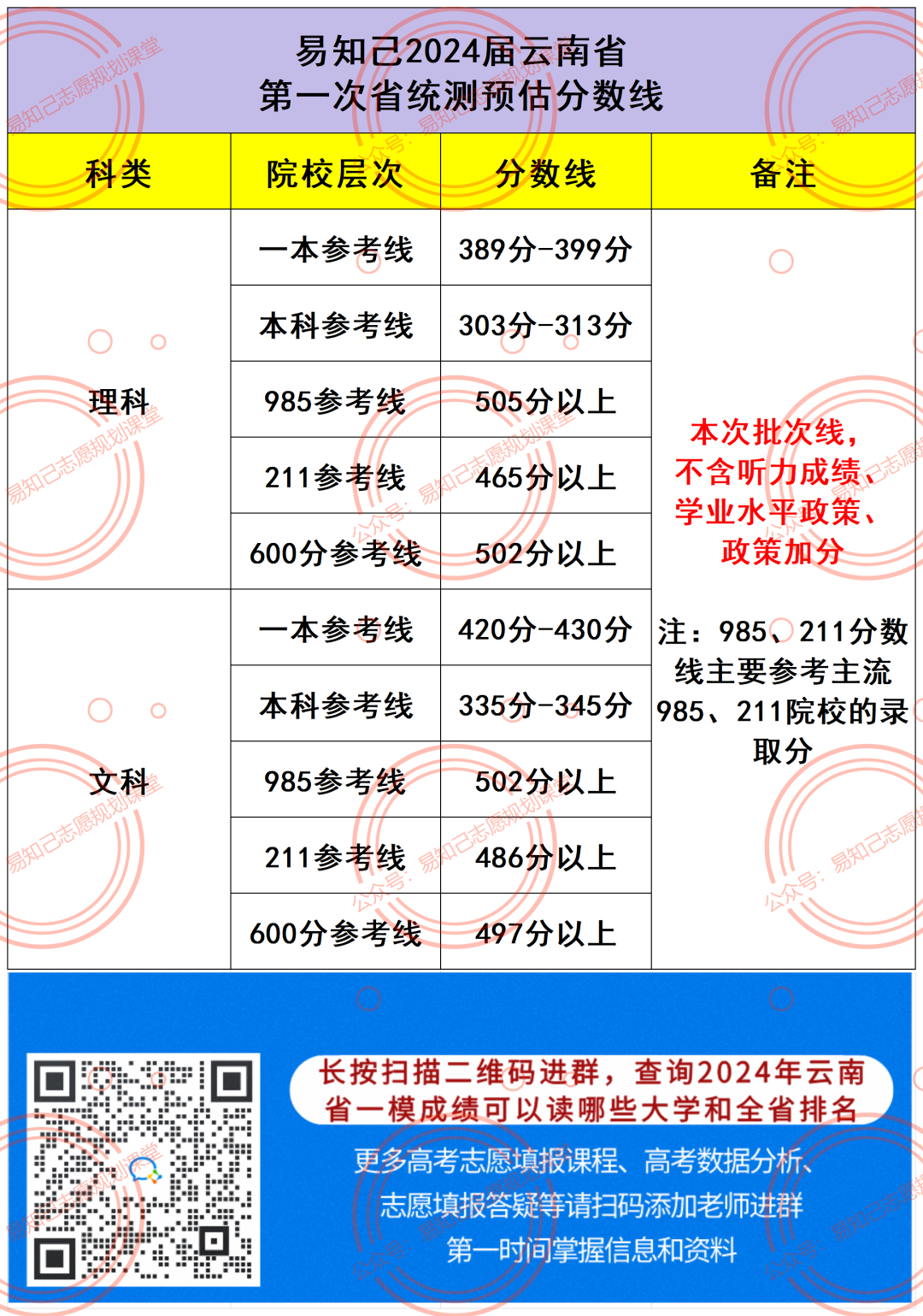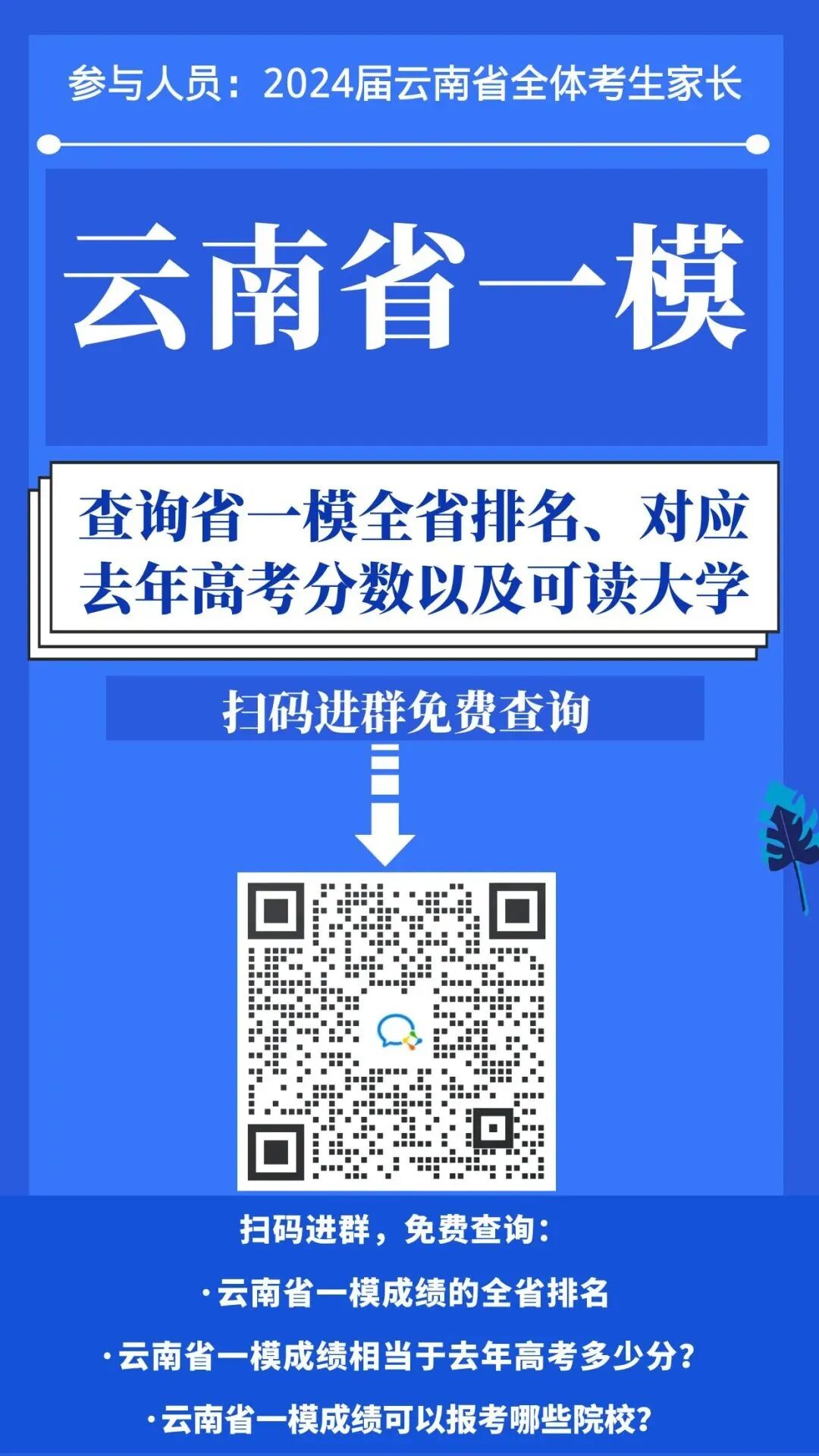 2024年云南高三第一次省统考成绩已公布,根据参考人数、考试难度、往年的批次线,易知己的开瑞老师对2024年云南第一次省统测的分数线做如下预测: 注:本表分数线仅供参考,未统计未参考的学生,预计比实际低10分,具体分数线以官方为准。 2024年云南省第一次统测考试,按照2023年高考一本、本科的录取人数,易知己对2024年高三第一次省统测的一本线、本科线做了判断,本次的一本线和本科线是裸分,不含听力和22分。 每天更新新高考选科资讯 下表是云南近6年高考批次线的对比,大家可以做一下参考: 2024年云南省第一次统测考试与2023年省二统的对比,发现整体分数下滑非常严重,文科560分以上只有12人,400分以上只有20725人;理科500分以上有5982人,460分以上只有15864人,400分以上有43021人,整体高分人数下降非常严重。 其中理科最高分为637分,文科最高分为573.5分。 本次省统测,理科数学平均分仅69.61分,文科数学平均分仅45.55分,相比去年省二模有所下滑。 云南省一模成绩 对应到去年的高考分数及 全省排名和可读的大学 云南省第一次省统测平均分公布,昆明市省一模理科平均分仅367.28,虽然仍然排在全省第一,但是和2023年相比下降了8.15分。其他大部分州市的理科平均分也都有不同幅度的下滑,迪庆下滑最严重,平均分下降了20.49分。 我们再来看看文科,曲靖市文科平均分为344.88分,排在全省第一,但是和2023年相比同样出现了下滑,平均分下滑了13.77分。 除了知道省一模的分数线以外,很多家长还迫不及待地来问易知己的老师自己孩子的分数在全省大概排在多少名? 孩子的成绩能不能上985、211?省统测的成绩是不是代表了高考的水平等等...... 基于此,易知己志愿规划师还准备一系列免费直播课程,大家同样可以扫码进群,免费预约课程!帮助孩子提前定位大学,让孩子更有目标感。 易知己志愿规划课堂根据近3年云南的录取情况,给大家大概归纳了一下文理科各个排名的情况。 理科: 985大学:全省5000名以前都有机会上985大学,但是还要看具体是哪个985大学! 211大学:主流的211大学,需要14000名以前,但是还要看具体是那个211大学。 一本大学:全省47000名以前有机会上一本; 本科大学:理科10万名以前都有可能上本科,要上公办本科,大约要70000名以前。 文科: 985大学:全省1000名以前都有机会上985大学,但是还要看具体是哪个985大学! 211大学:2500名以前,都有机会上主流的211大学,但是还要看具体是哪个211大学。 一本大学:13000名以前有机会上一本批次; 本科大学:全省4.4万名以前都有可能上本科,要读公办本科大约要25000名以前。 进群免费换算省一模成绩 点击下方图片查大学查专业 一键智能填报! 咨询更多新高考内容 扫码添加老师 ↓↓↓![]()