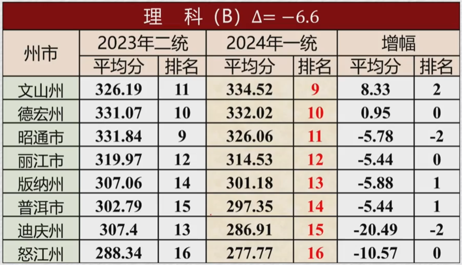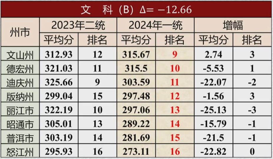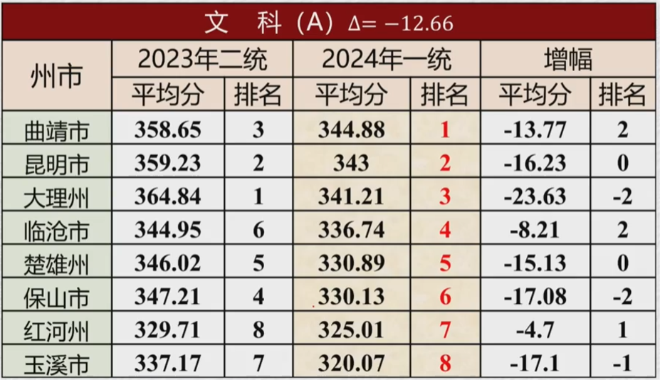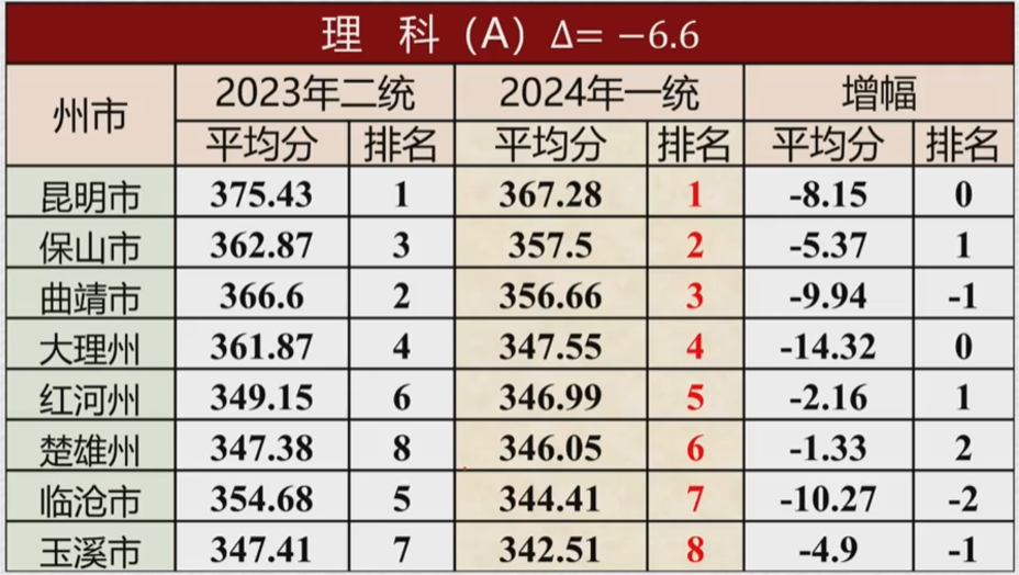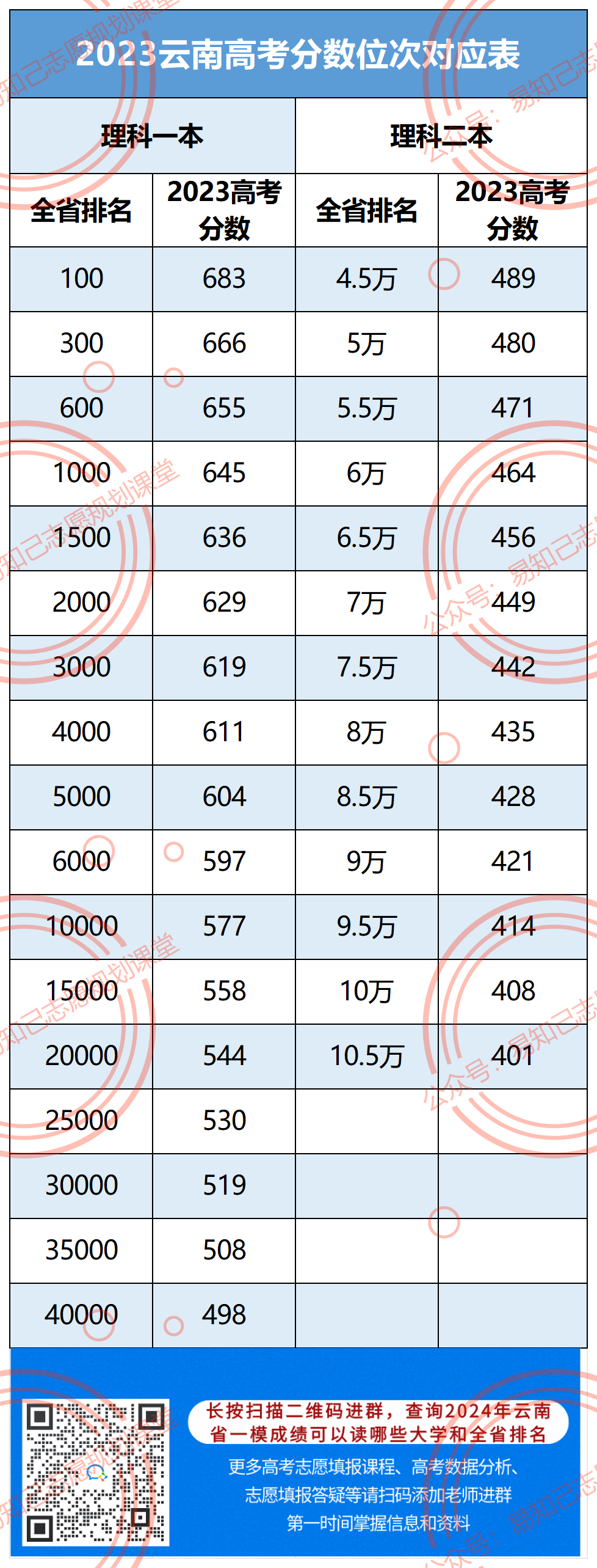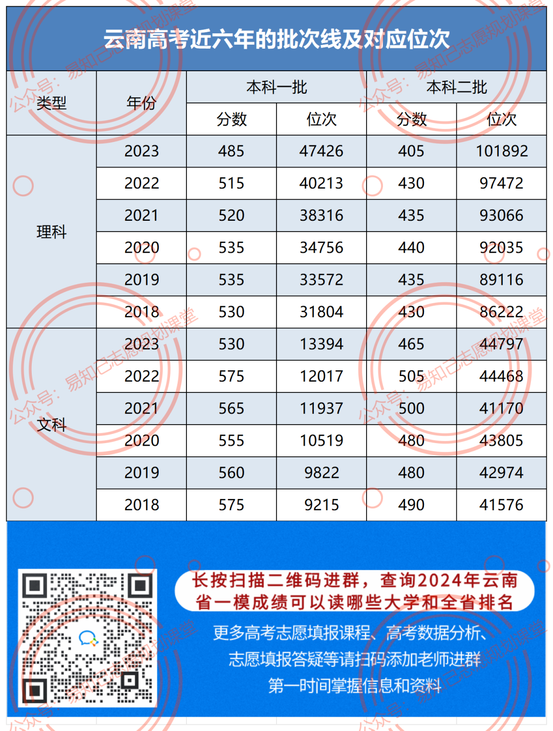 2024年云南高三第一次省统考成绩已公布,根据参考人数、考试难度、往年的批次线,易知己的开瑞老师对2024年云南第一次省统测的分数线做如下预测: 注:本表分数线仅供参考,未统计未参考的学生,预计比实际低10分,具体分数线以官方为准。 2024年云南省第一次统测考试,按照2023年高考一本、本科的录取人数,易知己对2024年高三第一次省统测的一本线、本科线做了判断,本次的一本线和本科线是裸分,不含听力和22分。 每天更新新高考选科资讯 下表是云南近6年高考批次线的对比,大家可以做一下参考: 2024年云南省第一次统测考试与2023年省二统的对比,发现整体分数下滑非常严重,文科560分以上只有12人,400分以上只有20725人;理科500分以上有5982人,460分以上只有15864人,400分以上有43021人,整体高分人数下降非常严重。 其中理科最高分为637分,文科最高分为573.5分。 本次省统测,理科数学平均分仅69.61分,文科数学平均分仅45.55分,相比去年省二模有所下滑。 云南省一模成绩 对应到去年的高考分数及 全省排名和可读的大学 云南省第一次省统测平均分公布,昆明市省一模理科平均分仅367.28,虽然仍然排在全省第一,但是和2023年相比下降了8.15分。其他大部分州市的理科平均分也都有不同幅度的下滑,迪庆下滑最严重,平均分下降了20.49分。 我们再来看看文科,曲靖市文科平均分为344.88分,排在全省第一,但是和2023年相比同样出现了下滑,平均分下滑了13.77分。 除了知道省一模的分数线以外,很多家长还迫不及待地来问易知己的老师自己孩子的分数在全省大概排在多少名? 孩子的成绩能不能上985、211?省统测的成绩是不是代表了高考的水平等等...... 基于此,易知己志愿规划师还准备一系列免费直播课程,大家同样可以扫码进群,免费预约课程!帮助孩子提前定位大学,让孩子更有目标感。 易知己志愿规划课堂根据近3年云南的录取情况,给大家大概归纳了一下文理科各个排名的情况。 理科: 985大学:全省5000名以前都有机会上985大学,但是还要看具体是哪个985大学! 211大学:主流的211大学,需要14000名以前,但是还要看具体是那个211大学。 一本大学:全省47000名以前有机会上一本; 本科大学:理科10万名以前都有可能上本科,要上公办本科,大约要70000名以前。 文科: 985大学:全省1000名以前都有机会上985大学,但是还要看具体是哪个985大学! 211大学:2500名以前,都有机会上主流的211大学,但是还要看具体是哪个211大学。 一本大学:13000名以前有机会上一本批次; 本科大学:全省4.4万名以前都有可能上本科,要读公办本科大约要25000名以前。 进群免费换算省一模成绩 点击下方图片查大学查专业 一键智能填报! 咨询更多新高考内容 扫码添加老师 ↓↓↓![]()