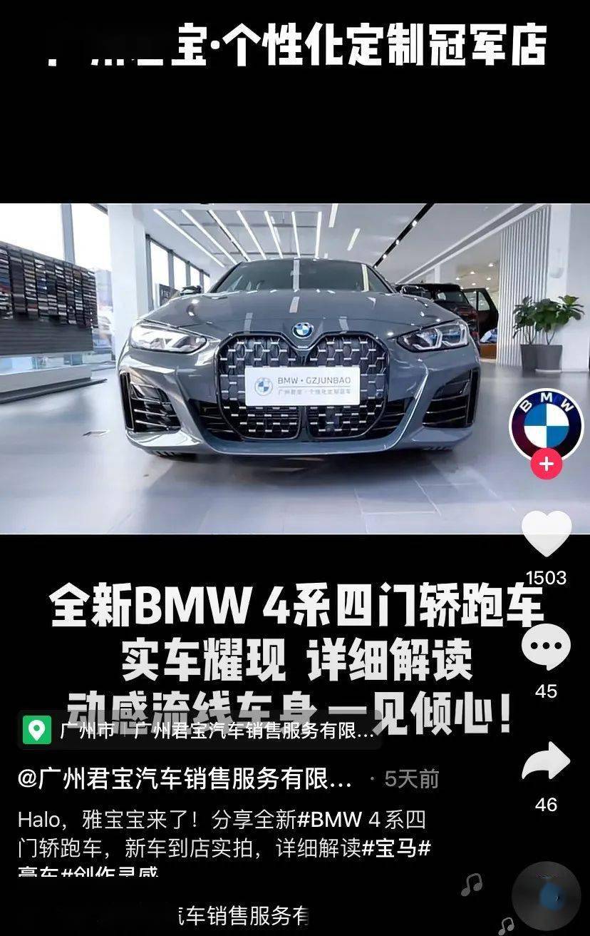 和传统的到店咨询客户不同,新媒体的客户通常都对车辆的行情和数据较了解,在大多数时候同城宝马4S店价格几乎都接近的情况下,新媒体客户会更加看重车辆的特殊性,比如特别的车漆颜色,另一方面就是哪家店有紧俏车到店,这些通过视频的形式都能快速直观地展示给所有人。