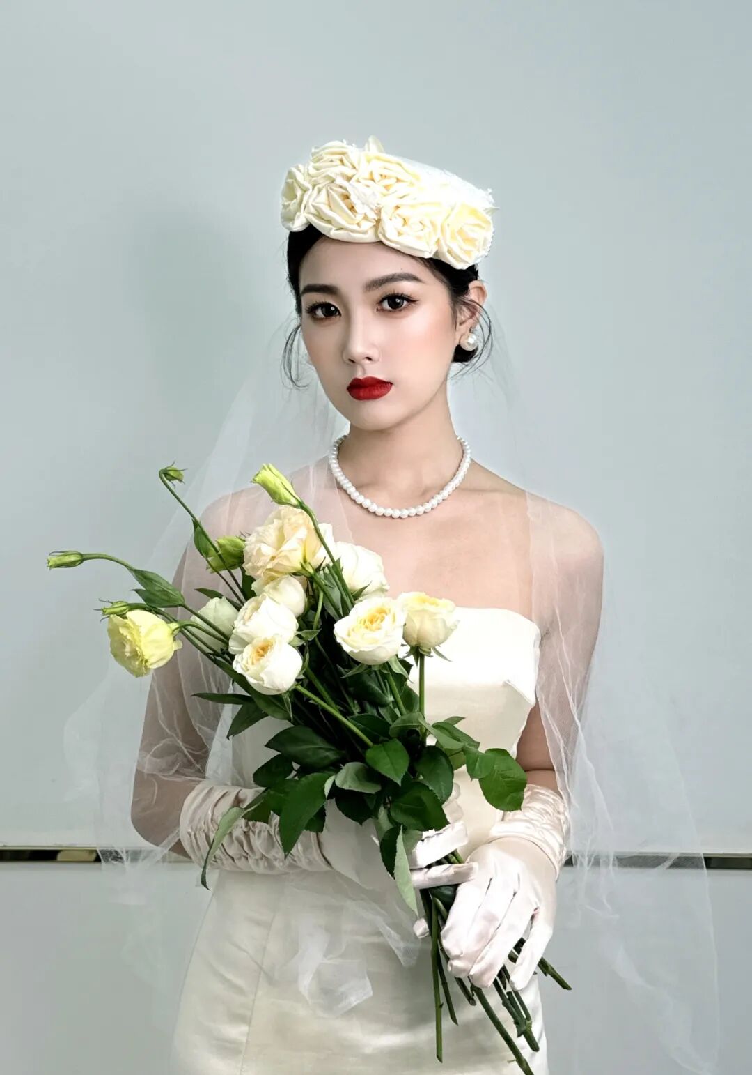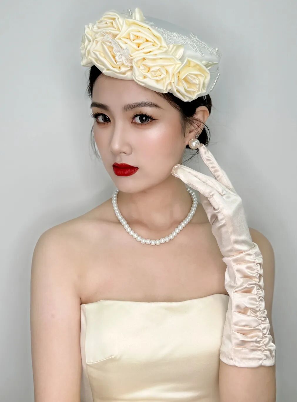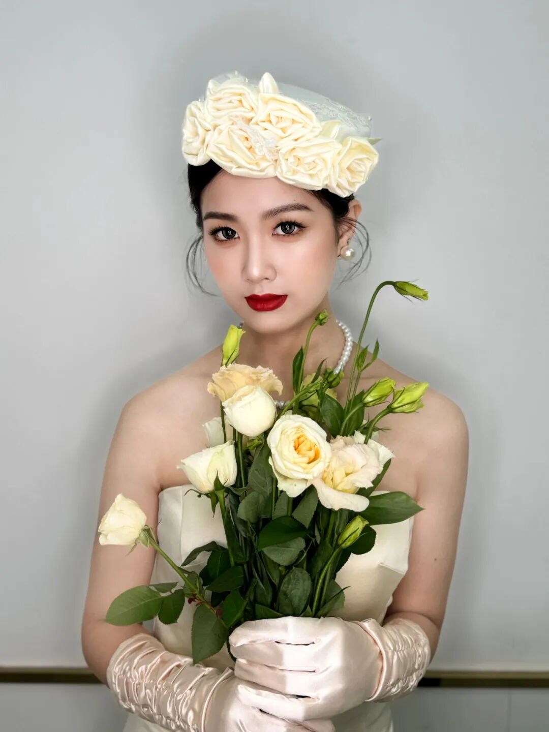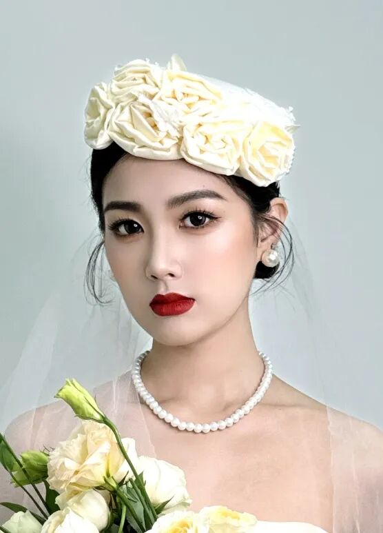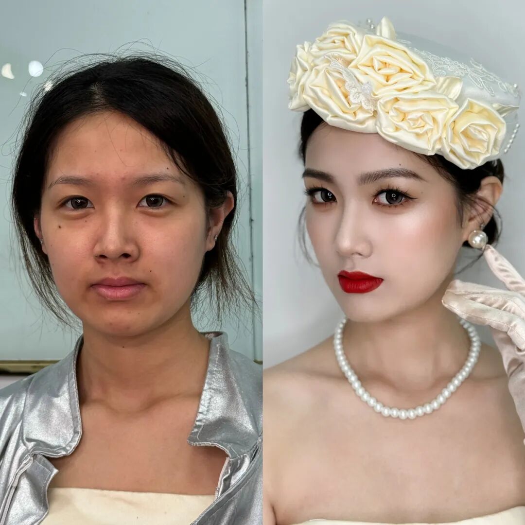 妆造学习篇 —— SUNNOW Makeup Learning 美丽梦想,始于首脑 首脑妆趣 01 妆容特点 < 02 新娘妆教程 面部分析 < 法式新娘款式 法式复古气质新娘妆造风格主要来源于对法国历史、文化和时尚的深刻理解与融合。这种风格不仅体现了法国的浪漫与优雅,还融入了复古元素,形成了独特而迷人的妆造风格。 底妆接近于本身肤色,整体立体无暇的状态,所以该在修容、高光的区域可以少量多次的叠加至拥有皮肤光泽质感。 把握以下点! 注意细节! 1.眼睛部位不需要五彩缤纷 < 用大地色系(推荐棕色、肉桂粉、咖调)做一个渐层式的深浅层次即可突出新娘的干净利落、简约大气。黑色的眼线,增加整体眼神的动人之处, 睫毛可选用相对自然根根分明的款式粘贴增加浓密度。下睫毛也可自然款式粘贴在真人睫毛根部,以放大整个眼睛。 2.腮红根据脸型去调整 < 腮红: 腮红可根据新娘脸型因人而异的打造范围,选色上可连接修容色,所以偏杏色、浅橙、裸粉或者咖调都可。 眉毛: 显立体气质的方式是眉毛雾加线条的感觉,唇部:运用复古红做满唇即可! 发型:扎一个干净的低盘,后面的头发可用卷筒的方式干净利落饱满的摆放,如同带上来美丽的小礼帽,让新娘的婚礼现场氛围感加满! 欢迎点击关注