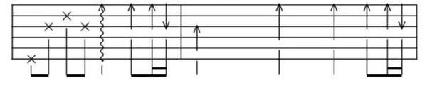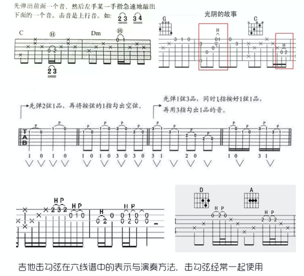 勾弦与击弦相反,它是从高音到低音的。看上图中间部分,在吉他6线谱中用一个英文字母“P"外加一个圆圈表示,英文Pull Off的缩写。这样演奏:先用两个手指同时按住两个音,右手弹响,然后再用后面的一个手指勾响琴弦,前面一个手指按住不放,发出声音,右手同样只是弹一次。如上图中间部分第一个勾弦,先用左手食指按住2弦一品,右手弹响琴弦,然后再用食指勾响琴弦,发出声音。击勾弦多数情况下会结合使用,如果一个音符添加两个倚音修饰,会用快速的击勾弦来演奏,看上图最下面。