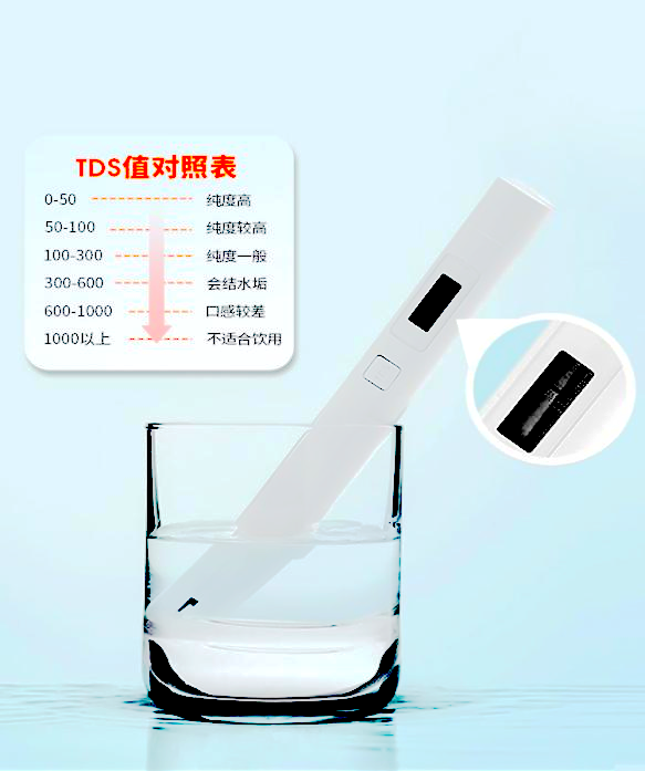 什么是水质检测笔? 水质检测笔又叫TDS试验笔,TDS水质试验笔是用于测试TDS值的水或水的导电性,以确定水的纯度或污染程度的简单便携式水质试验工具,同时具有测试水温和环境温度的功能。TDS值代表水中溶解物质杂质的含量,溶解物质含量越小,表示水质中溶解物质杂质越少,水质检测笔只能大概的评判一下水质的TDS值,它只是水质理化标准之一。 TDS值是否能够直接反映水质的好坏呢? TDS值不能直接反映水质的好坏,TDS值只是众多水质理化标准之一。水质检测笔主要是用来检测水的TDS值,也可以检测出水的导电率,它通常是用于评价蒸馏水、纯净水的指标之一。水质的好坏是需要多个指标共同评价的,例如微生物指标(菌落总数)、毒理指标(重金属离子浓度)、感官性状(色、嗅、味、肉眼可见物)和一般化学指标以及放射性指标等。 水质检测笔 水质检测笔在日常生活中有哪些用处呢? 在人们的生活中净水器已成为一个重要的生活用品,它能够对水质进行深度处理,去除水中的各种物质,已达到净化水质的效果。通过对比自来水和净水器处理后的水的TDS值,可以反映净水器的净水效果。如果处理后的水TDS值过高,说明水中溶解性物体越多,意味着净水器处理效果变差了,这是在提醒你该维护清洗或更换滤芯了。![]()