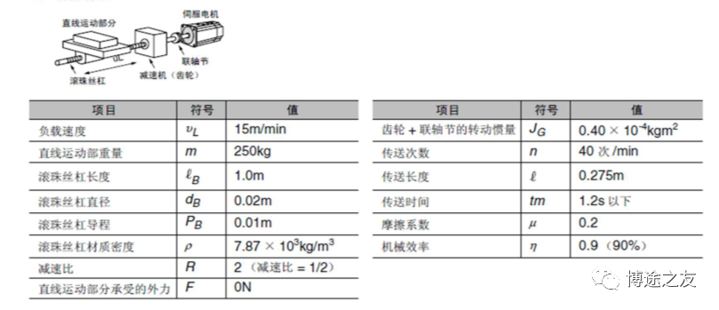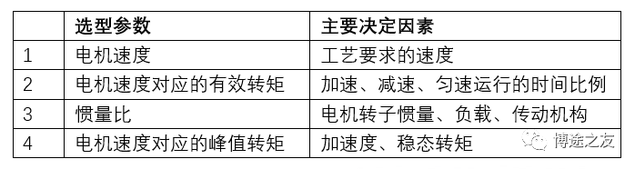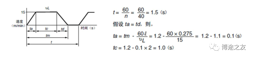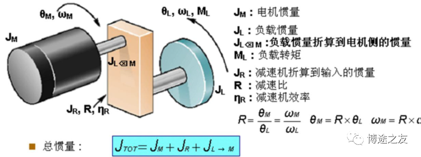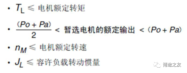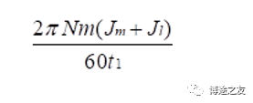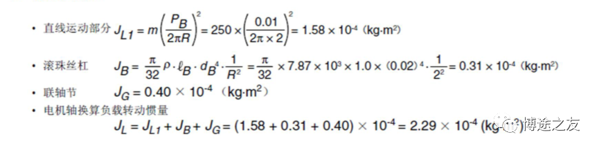 加入博途之友,与优秀工程师有约 在运动控制中,伺服电机的选择是第一步。如果伺服电机选择过小,容易导致在调试过程中电机动态特性无法调整,电机也很容易过载;如果选择过大,那么就容易造成电机资源浪费。因此,要做好运动控制,伺服电机的选择是第一步。 一、伺服电机选型的重要参数 在伺服电机的选型参数中,以下这几个参数是决定的电机选型的重要参数。 1、电机速度:一般是通过工艺节拍需求求出电机所需的速度,一般所需公式为: 2、电机的有效转矩:即匀速运动时电机的转矩,即所需额定转矩,一般公式为: 3、惯量比是很重要的一环,具体在后面讲述。 4、电机峰值转矩即电机加减速时候电机的转矩,即电机所需最大转矩,一般公式为: 二、伺服电机选型和核心参数:惯量和惯量比 惯量和惯量比是伺服电机选型中的很重要的一环,其中惯量的计算是不可或缺的。 1、惯量的基本定义 惯量:指的是物体对围绕一个旋转轴所产生的角加速度变化的阻抗,即对运动状态改变(加速或减速)的阻碍。 惯量与力矩的关系:ΣM=Jα,其中α是加速度,M是转矩,J是惯量 2、惯量比 惯量比是指运动物体的惯量通过机械传动机构后折算到电机侧的惯量与电机自身转子惯量之间的比值。 关于惯量比的经验总结: 1)惯量比越小,性能趋于更高,更容易控制。 2)若对快速响应与性能要求不高,惯量比可选到10。 3)惯量比的选择需要考虑刚性。若刚性强,可选择5-10;如果柔性强,则越小越好。 4)齿轮传动、齿轮齿条、丝杆传动等刚性较强。同步带传动、链传动等则柔性较强。 三、各种机械传动中惯量的计算 1、圆柱体惯量(中心线与旋转轴平行) 如图所示,d0为外径,d1为内径,l为长度,e为圆柱体中心线与旋转轴线的距离,则该物体计算公式为: 2、圆柱体惯量(中心线与旋转轴垂直) 如图所示,d0为外径,d1为内径,l为长度,e为圆柱体重心线与旋转轴线的距离,则该物体计算公式为: 3、方形物体惯量 使用如图所示,X为长度,Y为宽度,Z为高度,e为圆柱体重心线与旋转轴线的距离,则该物体计算公式为: 4、丝杆惯量计算 丝杆的惯量与丝杆的摆放无关,即无论是丝杆的水平运动还是垂直运动,惯量是一致的,唯一变化的是外力。在垂直运动时,电机需要出力用以平衡负载的自身重量。 如图所示,M为负载质量,PB为丝杆导程,DB为丝杆直径。 四、选型案例 1、工艺参数确定与机械参数确定 2、确认最高工艺节拍速度曲线 3、计算电机用到最高转速 4、负载转矩计算 5、传动部分总的惯量 6、负载行走功率 7、负载加速功率 8、伺服电机的选择 感兴趣的企业朋友可以添加作者微信 电机选型 (非诚勿扰) 芮老师的书籍 ![]()