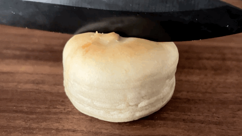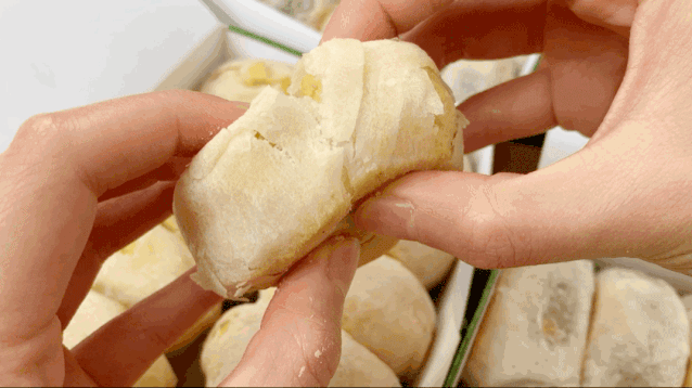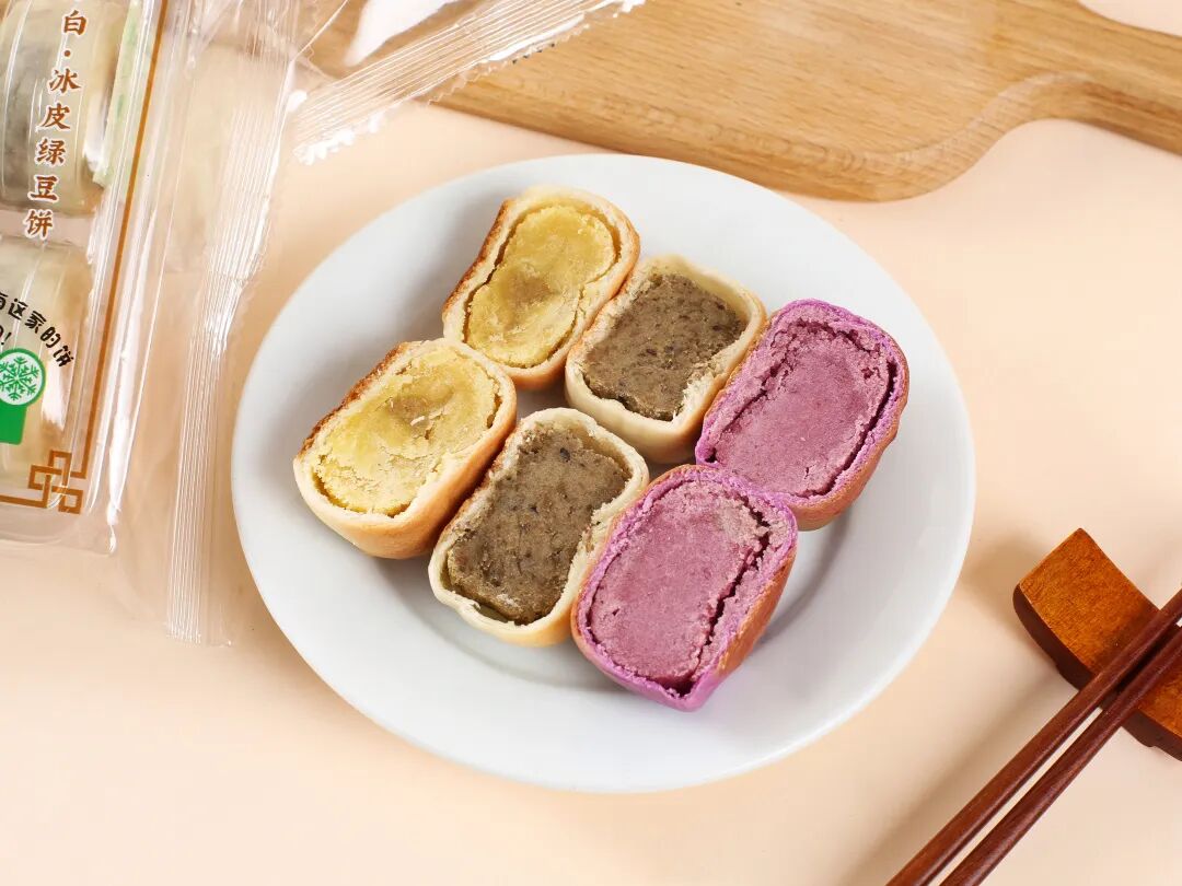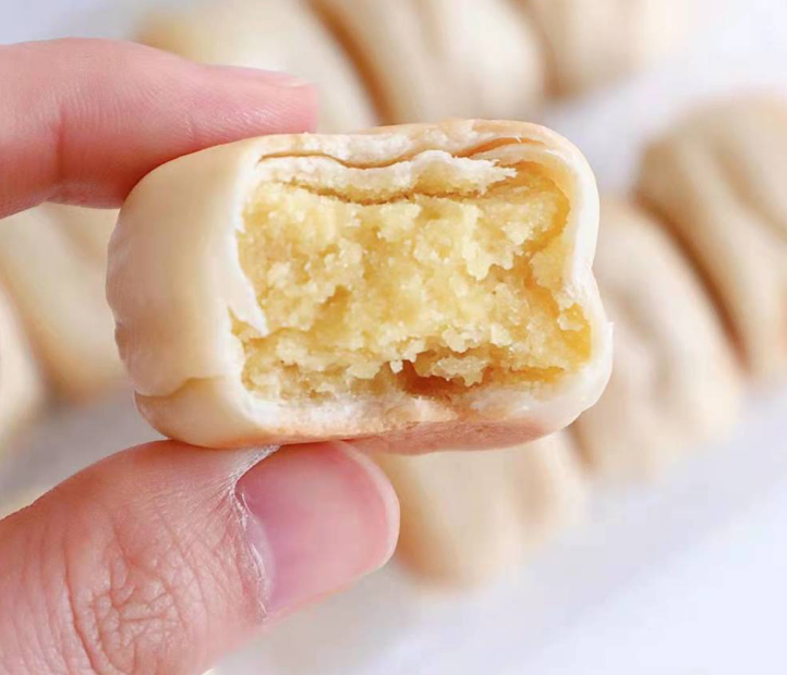 跟市面上大部分绿豆饼不一样, 冰皮绿豆饼这款绿豆饼用的是冰皮,相比于酥皮,冰皮口感清爽,皮松而不散,内层软滑。