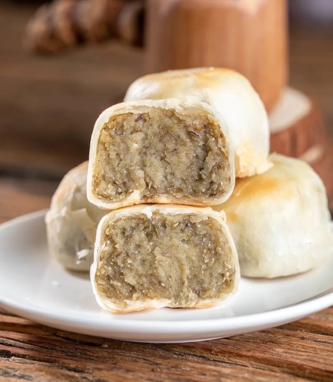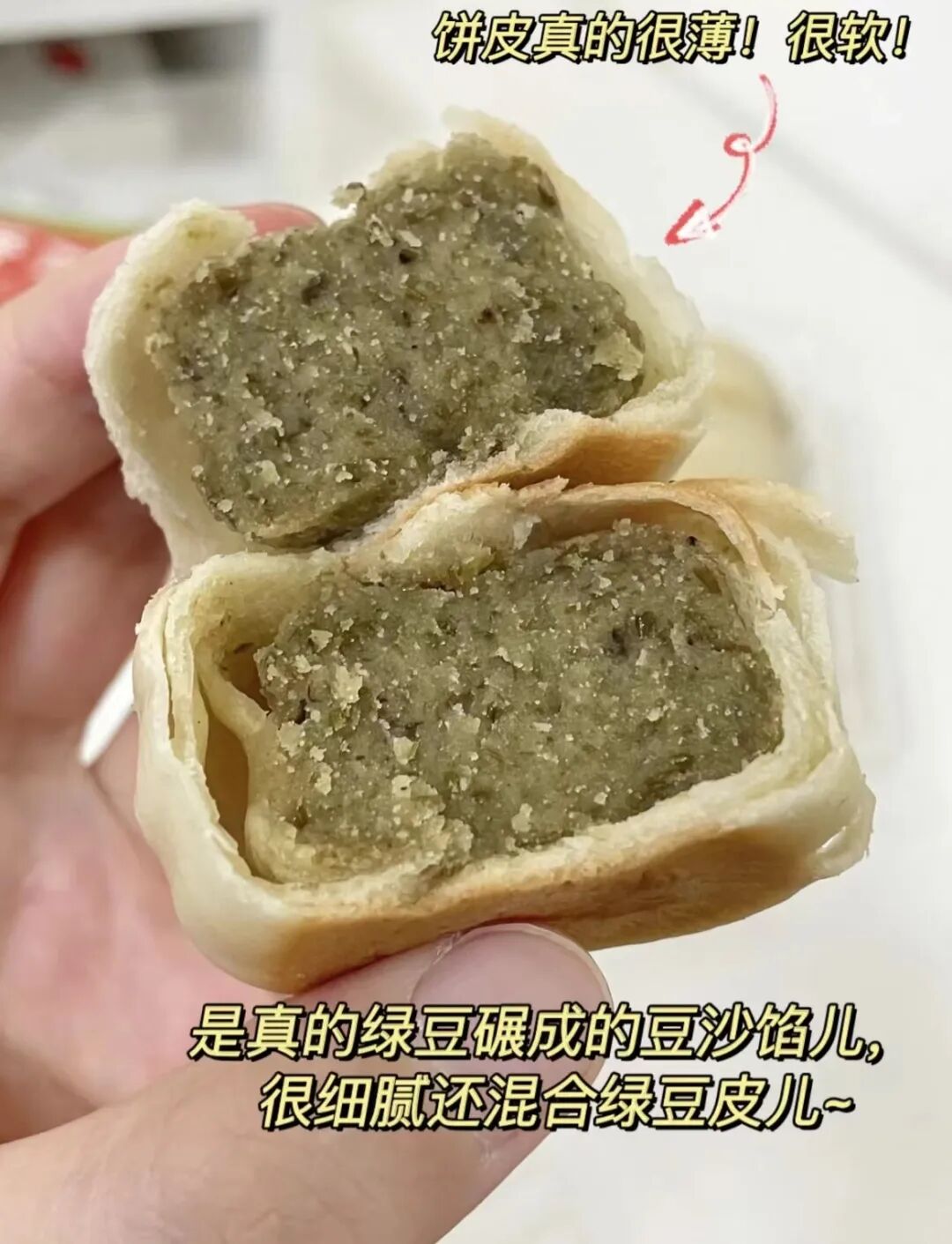 经典的绿豆味,简单的外表不简单的味道,口感清爽,皮松而不散,内层软滑,一口下去,豆香便流入口中,内馅可跟外皮不同,内馅质地有些许颗粒感,豆香味浓郁,入口即溶.