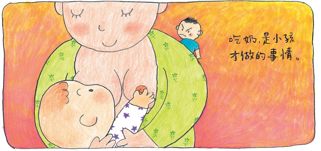 其实,像《我为什么讨厌吃奶》这样的绘本,我觉得,大人还是要用“无邪”的眼光来看待。我们常说孩子天真无邪,在年幼的孩子那里,的确体现出这一特点,没有大人关于性方面的观念——大人觉得这些绘本“尺度大”,那是他们不洁的观念包括性意识在起作用。小孩子不会这样,他们是对成人身体的好奇和观察。