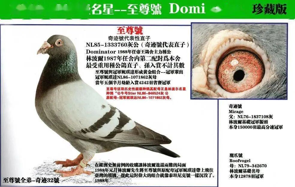 1、杨阿腾鸽系以深油黄眼、绿眼为高级鸽眼,属于晚熟品系。
