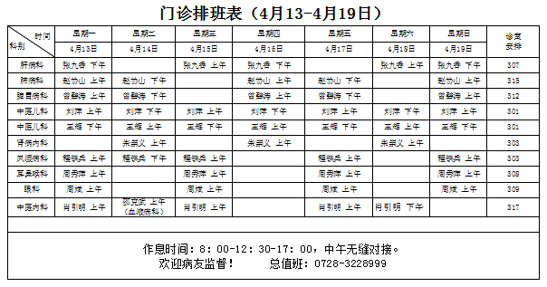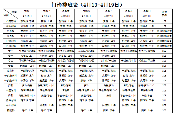 尊敬的各位病友: 为进一步做好新冠肺炎疫情防控期间的医疗服务工作,防止医院内交叉感染,我院门诊自3月26日起逐步恢复正常诊疗秩序,以满足广大病友的就医需求,并对诊疗工作安排一周一公示。现就4月13日-4月19日诊疗活动做如下规定,具体如下: 一.门诊就诊时间为: 上午班:8:00-12:30 下午班:12:30-17:00 二.门诊开放的诊室及楼层安排 (一)1楼:心脑病科,西医内科,普外科,门诊儿科 102诊室(心脑病科,西医内科)坐诊医师:彭玲梅,黄静,刘爱清。 急诊外科诊室(普外科)坐诊医师:荣成方,刘少平。 急诊骨科诊室(门诊儿科)坐诊医师:昌海燕,刘艳荣。 (二)2楼:门诊骨科,皮肤科,针灸推拿科,妇产科,辅检科室 1.门诊骨科: 201诊室坐诊医师:平功群,叶劲立,刘小军,马泽明,刘伟,李进光,邓念文。 202诊室坐诊医师:张文超,梁魏峰,刘先平,易国红。 203诊室坐诊医师:朱东红,向进标。 204诊室坐诊医师:胡洪军。 2.皮肤科: 205诊室坐诊医师:李朝阳,郭航。 3.针灸推拿科:(只作门诊筛查,需要进一步治疗者入院治疗) 206诊室坐诊医师:武国华,彭德,徐泽仿,赵爱发。 4.妇产科: 207诊室(妇科)坐诊医师:尹玲,马骏,陈琦。 208诊室(中医妇科)坐诊医师:陈琦,王俊平。 209诊室(产科)坐诊医师:马骏,朱霞。 5.辅检科室:(B超,心电图,血检)在门诊二楼正常应诊;其他辅检科室:(放射,CT)在住院部一楼;磁共振检查目前只针对经过缓冲病区筛查后的住院病人开放。 (三)3楼:中医内科,中医儿科,耳鼻喉科,眼科,血液病科 301诊室(中医儿科)坐诊医师:刘萍,王辉。 302诊室(内分泌科)坐诊医师:吴佳武。 303诊室(肾病科,风湿病科)坐诊医师:朱崇义,程铁兵。 305诊室(肝病科)坐诊医师:高虹。 307诊室(肝病科)坐诊医师:张九香。 308诊室(耳鼻喉科)坐诊医师:周秀萍。 309诊室(眼科)坐诊医师:周斌。 312诊室(脾胃病科)坐诊医师:曾碧涛。 314诊室(神经内科)坐诊医师:高卫华。 315诊室(肺病科)坐诊医师:赵协山。 317诊室(中医内科,血液病科)坐诊医师:肖引明,邵克武。 三.门诊排班表: 四.仙桃市中医医院病区患者及陪护人员管理要求 我院已逐步恢复正常诊疗,为有效防控新冠肺炎疫情,保障人民群众生命安全和身体健康,根据《湖北省新冠肺炎定点医疗机构恢复日常诊疗服务工作指南》和《湖北省恢复正常医疗工作期间院感防控重点要求》等相关文件要求,对病区患者及陪护人员做如下要求: 1.需住院患者必须在门诊完善肺部CT(对于市一医、三医、四医五天内的肺部CT片及检查报告单予以认可)和血常规检查,排除新冠可能者方能收入缓冲病区。 2.缓冲病区患者单间隔离,通过核酸、体温监测等排除新冠再转入普通病区多人居住。在病情允许的情况下,患者应佩戴外科口罩。 3.患者如果病情允许,尽可能不设陪护;必须陪护时,陪护必须在我院门诊进行新冠筛查(肺部CT和血常规),排除后允许入院陪护。陪护在病区做好个人防护,每名患者仅允许一名陪护,更换陪护人员,需重新进行新冠筛查,合格后方可更换。 4.严格探视制度,住院期间原则上不允许探视,若患者病情危重必须探视的,探视者必须做好个人防护方可进入。 5.病区严格监测患者及陪护体温(每日两次)、呼吸道症状、影像学表现、血常规等情况并记录,病区患者或陪护一旦出现异常,应严格遵守我院转诊流程进行转诊,不得自行离开。 6.病区护士做好住院患者和陪护健康宣教,如手卫生、佩戴口罩、咳嗽礼仪等。 7.病区实行全封闭式管理,住院患者及陪护不得随意离开病房,且严禁患者之间相互接触,餐饮实行订餐制。 8.患者及陪护人员应自觉遵守相关法律法规及医院的规章制度,遵从工作人员指导,配合维持良好的医疗环境和秩序,不得随意占用空床,调换或两人睡一张床;不在病区内吸烟、不随地吐痰,垃圾分类放置。 9.各科护士长为病区陪护及患者管理责任人,应安排专人负责科室陪护及患者管理。 10.未尽事宜,另行规定。 特别注意:办理住院手续需向住院收费室提供以下三样资料 住院证(标明收住缓冲病区楼层) 胸部CT检查报告单(患者本人及陪护家属) 身份证 仙桃市中医医院 2020年4月12日![]()