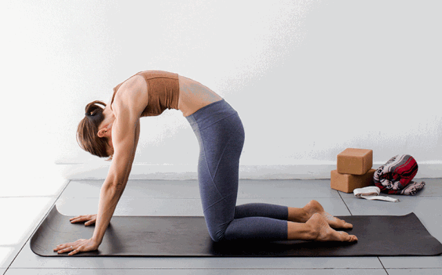 膝盖着地,对齐髋部,双脚踩地,双手撑地,对齐肩膀,吸气延展脊柱,呼气抬起双脚,低头弓背,双脚踩地,重复10次。