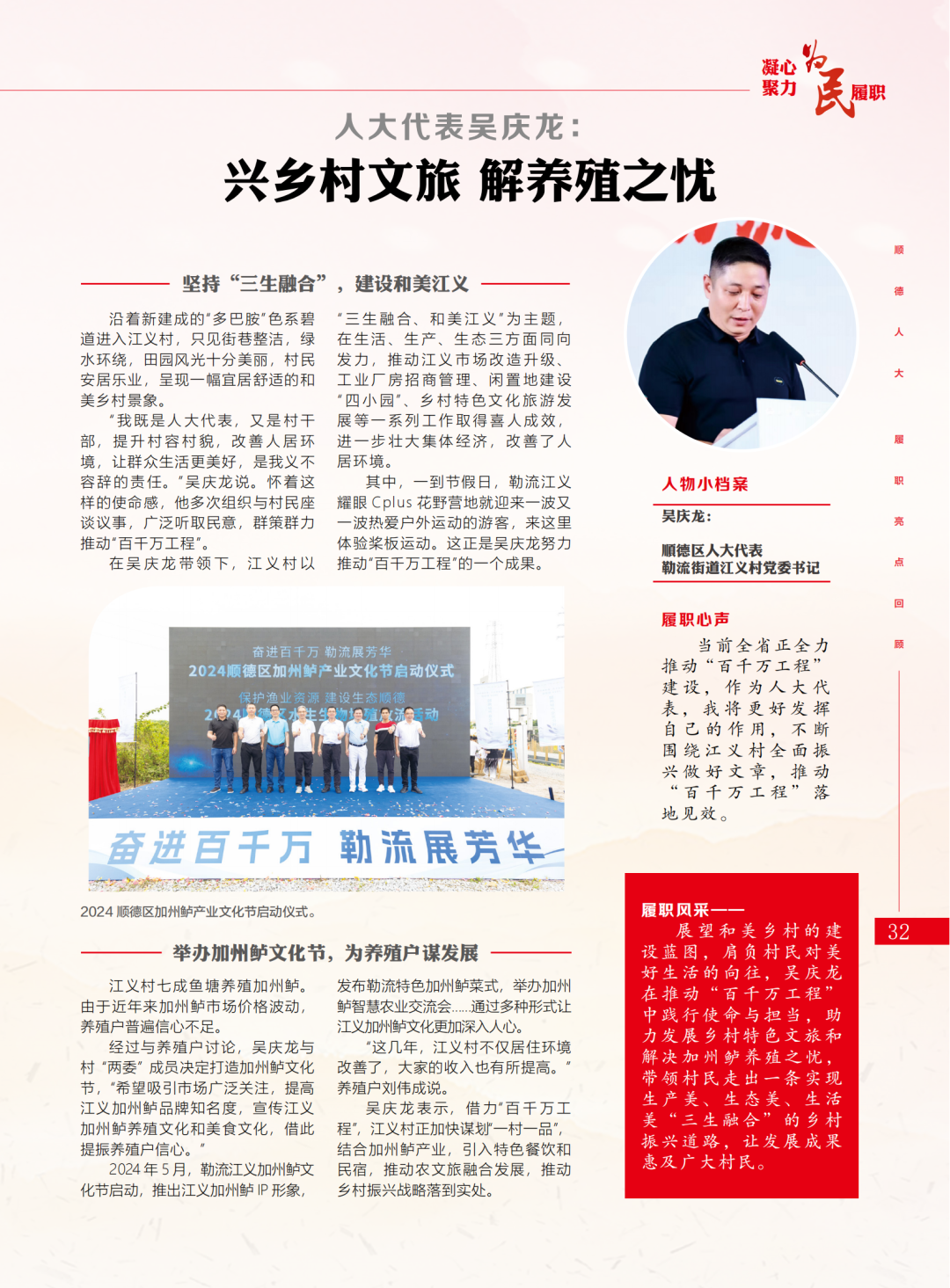 经过与养殖户讨论,吴庆龙与村“两委”成员决定打造加州鲈文化节,“希望吸引市场广泛关注,提高江义加州鲈品牌知名度,宣传江义加州鲈养殖文化和美食文化,借此提振养殖户信心。”