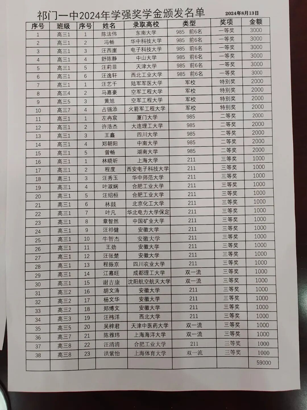 8月13日上午,祁门一中第五届“学强奖学金”颁奖典礼在学校伟长楼报告厅隆重举行。学校领导班子、2024届高三年级部负责人、第五届“学强奖学金”获奖学生、2025届实验班和2026届实验班学生出席颁奖典礼。 祁门一中副校长吴晓清主持颁奖典礼。据介绍,祁门一中每年从“学强奖学金”资本金利息中拿出一定资金对当年在高考中表现突出的学生进行奖励,奖励范围主要包括当年录取到985、211、双一流、军事院校、警察院校的同学,祁门一中前任校长张进球先生为“学强奖学金”基金会筹备组负责人。祁门一中“学强奖学金”至今已颁发四届,今年为第五届,共有38位优秀毕业生获得第五届“学强奖学金”的资助。连续五届累计有115位优秀毕业生获得祁门一中“学强奖学金”,累计发放23.5万元奖学金。 祁门一中副校长胡爱军宣读《关于表彰2024年“学强奖学金”获得者的决定》 按照奖学金管理办法,本着公平、公正、公开的原则,经过学校评审委员会评审,决定表彰陈法伟等38名同学为 2024年 (第五届)“学强奖学金”获得者。2024届理科实验班陈法伟、冯畅、汪西崖、舒陈静、汪莉菲、汪逸轩6人分别荣获2024年“学强奖学金”一等奖,各获得奖学金人民币 3000元;2024届理科实验班汪艺千、4 班马嘉豪、5 班黄旭、7班占锡添4人被录取为军校生,分别荣获 2024年“学强奖学金”特别奖,各获得奖学金人民币 2000元;2024届1班左冉宸等5 人被录取为 985 高校新生,分别荣获 2024年“学强奖学金”二等奖,各获得奖学金人民币 2000元;2024届理科实验班林晓昕等 23 人分别荣获 2024年“学强奖学金”三等奖,各获得奖学金人民币 1000元。希望获得奖学金的同学谦虚谨慎、再接再厉;希望全体同学以受表彰的同学为榜样,认真学习,锐意进取,不负父母老师的殷切期望,不忘社会爱心人士的关心和帮助,不断超越自我,追求卓越,成就更美好的自己。 颁发三等奖23人,分2批次进行颁奖。 颁奖人:2024届高三年级部部长、学校工会主席邱勇兵 颁发二等奖5人(985高校录取新生) 颁奖人:祁门一中副校长胡爱军 颁发特别奖4人(军事院校录取新生) 颁奖人:祁门一中校长胡铁城 颁发一等奖6人(高考总分前6名的985高校录取新生) 颁奖人:祁门县委教育工委书记、教育局局长、祁门一中党总支书记李强 以上为第五届获得“学强奖学金”的38人名单 获奖学生代表陈法伟发言,表示“学强奖学金”代表着荣誉,也代表着责任,高考不是人生的终点,而是一个崭新的起点,追光的路程不会停歇。 2025届学生代表项立然发言表态,将以学长为励志榜样,努力编织自己的人生梦想,将怀揣着激情与梦想奋勇前行,书写属于自己的辉煌篇章。 祁门一中校长胡铁城在第五届“学强奖学金”颁奖典礼上致辞,对获得表彰奖励的学子致以最热烈的祝贺。表示,每一个为梦想而不懈奋斗与努力的人都令人肃然起敬! 胡铁城回顾了“学强奖学金”的发起和发展壮大的历程——“学强奖学金”是祁门一中1966届杰出校友、广东中山大学教授、博士生导师、二级主任医师、国内神经内科顶级专家胡学强于祁门一中建校80周年庆典期间个人捐资40万元旨在激励祁门一中品学兼优的优秀学生奋发有为而发起设立的奖励基金,胡宏杰、凌定华、许惠芳、陈校园、程玉萍、倪志斌、方利、汪国升、汪县军、戴东生、任建国、汪建平、汪美丽、陈婷婷、胡根强、王丽霞、陈洪旺、李江锋、沈小平、周国松、郑际生、戴小兰、徐旸、刘惠英等热心校友和爱心企业家先后向“学强奖学金”注资,目前本金总额达561.5万元。特别令人感动的是胡学强教授在儿子的婚宴上宣布:再次个人出资,向“学强奖学金”捐资60万元!胡学强教授对教育的热情、创造的巨大社会价值无疑是一种博大情怀与胸襟的体现。 胡铁城指出,五十多年前,胡学强教授只是祁门一中普通学生中的一员,工作之后,他在祁门先后当过教师、医生,是什么激励着他走出祁门,一步一个脚印走向成功?源于他不甘平庸和始终不息的梦想追求!我们所有人都应该像胡教授那样,乐观、开放、包容、充满活力,把为社会创造价值作为自己终生的奋斗目标。心之所向,素履以往。把这句话赠给各位同学,热爱生命,为社会创造更多的价值,在未来的岁月里建功立业,创造出更加优异的成绩,不辜负“学强奖学金”注资者的赤子之心! 摄影报道:惠振坚 颁奖之后,2024届高三年级部副部长江山带领获奖学生到人武部参加国防教育活动。 附:祁门县第一中学“学强奖学金”管理办法 祁门县第一中学“学强奖学金”管理办法 第一章 宗旨及适用范围 第一条 “学强奖学金”是由祁门一中1966届杰出校友、中山大学教授、一级主任医师、博士生导师、神经内科著名专家胡学强先生个人捐赠人民币肆拾万元(¥400000)设立,同时吸纳其他杰出校友自愿捐资,以每年本金的净收益额作为当年优秀学生奖励的一项永久性奖学金(以下简称“本奖学金”)。 第二条 本办法适用对象为本校品学兼优且在高考中取得优异成绩的应届高中毕业生和在每年中考中成绩优异并被祁门一中录取的高一新生。 第二章 资金运营管理 第三条 本奖学金以祁门一中杰出校友胡学强捐赠的人民币肆拾万元(¥400000)和其他企业家、杰出校友捐资之总金额为本金,其所有权归祁门县第一中学。 第四条 祁门一中“学强奖学金”管理委员会(