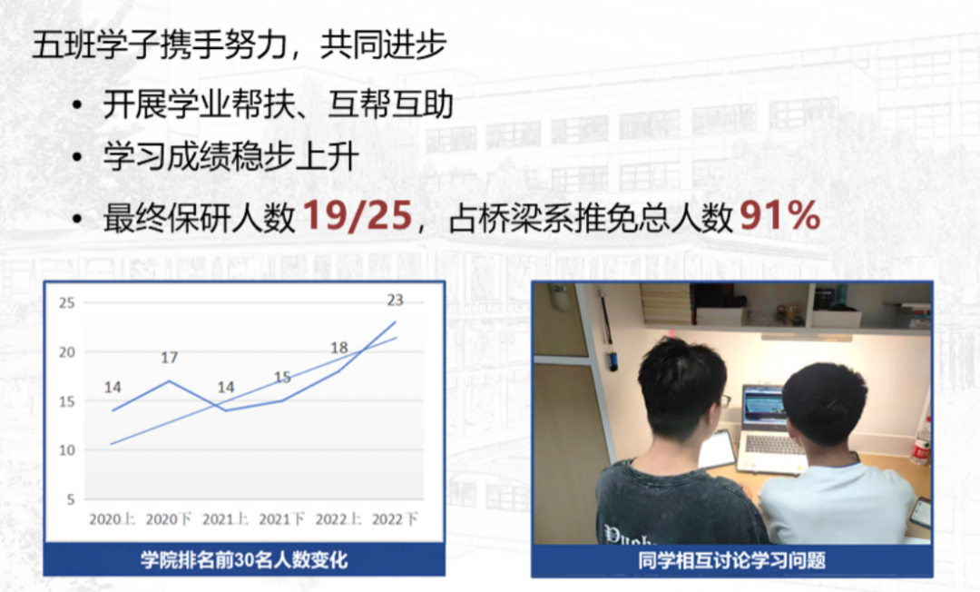 编者按 乘众人之智,无不任也,聚众人之力,无不胜也。公路学院桥梁五班的同学们来自五湖四海,相聚于渭水之滨,在同窗学习中凝聚起团结的力量,在相伴成长中分享着进步的喜悦。他们是循着知识的桥梁不断探索的耕耘者,是踏着科创的浪头迎难而上的弄潮儿,是举起理论的红旗躬身实践的奉献者,是熠熠生辉的团队之星! 团队介绍 长安大学公路学院桥梁工程五班,班级成员25人。前三学年班级平均加权绩点90.012,位全院第一。全班同学实现0挂科,共有19人获得推免资格,占桥梁工程系总推免人数(21人)的91%。班内7人次获国家奖学金,12人次获国家励志奖学金,7人获社会奖学金,40余人次获校园贡献奖、学业优秀奖,获课程优秀奖累计数量114个,累计获奖学金23万8千200元。班级成员积极参加学科竞赛与科创竞赛,获得国家级奖项18人次,省级奖项30人次,班级成员竞赛参与率85%,科研项目参与率85%。 1 知止后定,坚定信念指引 “风清则气正,气正则心齐,心齐则事成”。班级在成立之初便健全了组织架构,团支部书记、组织委员、宣传委员等班干各司其职,扎实推进团建工作。他们重视思想政治教育,定期开展“三会两制一课”,切实提高思想政治水平、认知水平和理论水平。在班干部的带领下,支部进行了30余次主题团日活动,其中2022年12月10日开展的“喜迎党的二十大,走好青春奋进路”主题团日活动在五四评优中获得“活力团支部”。 班级成员们就这样在共同的理论学习中凝聚信念,推动班级凝聚,形成正向循环,在奋斗路上用赤诚之心谱写青春乐章。这样的热忱不止反映在理论学习中,更体现在校园生活的点点滴滴里。班委们以身作则,积极作出表率,组织各种形式的班级活动,增强同学们的凝聚力和归属感。在这样的号召下,班级思想氛围先进融洽——班级成员积极向党组织靠拢,入党申请书递交率为100%,支部内成员获“优秀共青团员”“优秀青年志愿者”“优秀团干部”“先进个人”“抗疫青年标兵”“优秀青年抗疫志愿者”等荣誉奖项近40人次。 2 脚踏实地,坚定创新理念 桥梁五班的同学深知“独学无友,则孤陋而寡闻也”,于是由班委牵头,并根据同学们的学习需求成立了各具特色的学习小组,以强带弱,互相促进,自学习小组成立后,班级成员优秀率达85%,科创竞赛参与率达85%;这个大家庭努力营造了健康有序的学习环境和良好竞争氛围,构成了互帮互助,团结协作的良好学风。 大三下学期的实习是他们最难忘的回忆。桥梁五班同学们坐上了开往南京的绿皮火车,进行桥梁工程实习。那是一次理论与实践深度结合的学习之旅,同学们亲身体验并理解桥梁工程的设计、建造与运维的全过程,不仅对大型桥梁工程的发展趋势和技术前沿有了深刻的了解,也对桥梁工程师这份职业的工匠精神肃然起敬。他们将这份对桥梁专业的热爱转为继续探索的动力,在课堂学习之余,抽出时间进行科创实践。班内共有18人次在学科竞赛和科创竞赛方面获得第四届“茅以升公益桥”国家三等奖、全国周培源大学生力学竞赛国家二等奖等国家级奖项,共有30人次获大学生数学竞赛省级二等奖、互联网+大学生创新创业大赛省级银奖等省级奖项。共同进步是他们能为之团结奋斗的目标,交通强国是他们愿为之身体力行的希冀。 3 凝心聚力,散发班级光芒 时有所需,必有所为。时代对大学生的要求早已不局限于专业知识水平,而公路学院桥梁五班的同学们也早已学会把社会责任扛在肩上。班级成员参与志愿活动人数达100%,活动参加人次达80余次,服务时长1000余小时。在暑期社会实践、优秀学子回母校、献血活动、善行一百等志愿服务中,同学们身体力行地奔跑在祖国的大地上,共同体会着做志愿的价值和意义。抗洪抗疫期间,班级成员积极响应团中央和各地政府的号召,前往一线,涌现出18名疫情防控志愿者。十四运期间,班级有2人顺利完成全运会田径赛事群演服务。 班级同学携手并进,在各类学生工作中积极进取,共创班级荣光。班内共有14名同学在学生组织以及社团中留任,如学校彩虹心理协会副主席、学院大学生科技创新创业协会主席、学院文体协会文艺部部长、学院助管等,占比达56%。他们在各个团队中积极负责,在任职期间带领组织及社团获得国家级善行一百优秀组织奖,校级优秀学生社团,“芙蓉学子奖学金”校级优秀组织奖等荣誉,工作成绩广获好评,在不同岗位发光发热。 四年相伴的时光转瞬即逝,无数共同进步的日夜让桥梁五班凝聚了独属于他们的默契。他们彼此支持,共同成长,建立了深厚的友谊,也为青春书写了一段难忘的时光印记。星光耀眼的奖项不是前进的终点,身为种子的他们会扎根在时代的土壤厚积薄发,用奋斗的汗水,拥抱灿烂的未来。 出品 / 党委宣传部 资料来源 / 公路学院桥梁五班 文字 / 刘文青、闵海燕 编辑 / 王鑫尼、李耀 责任编辑 / 黄天怡、朱颜![]()