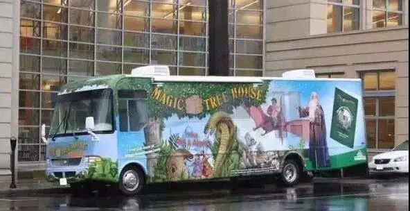 美国图书馆门口以“神奇树屋”为主题的巴士车身