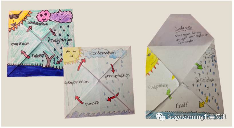 一个正方形的四角向内折叠,形成一个开口的信封。可以在每一面上标注内容。下图是一个水循环的过程。