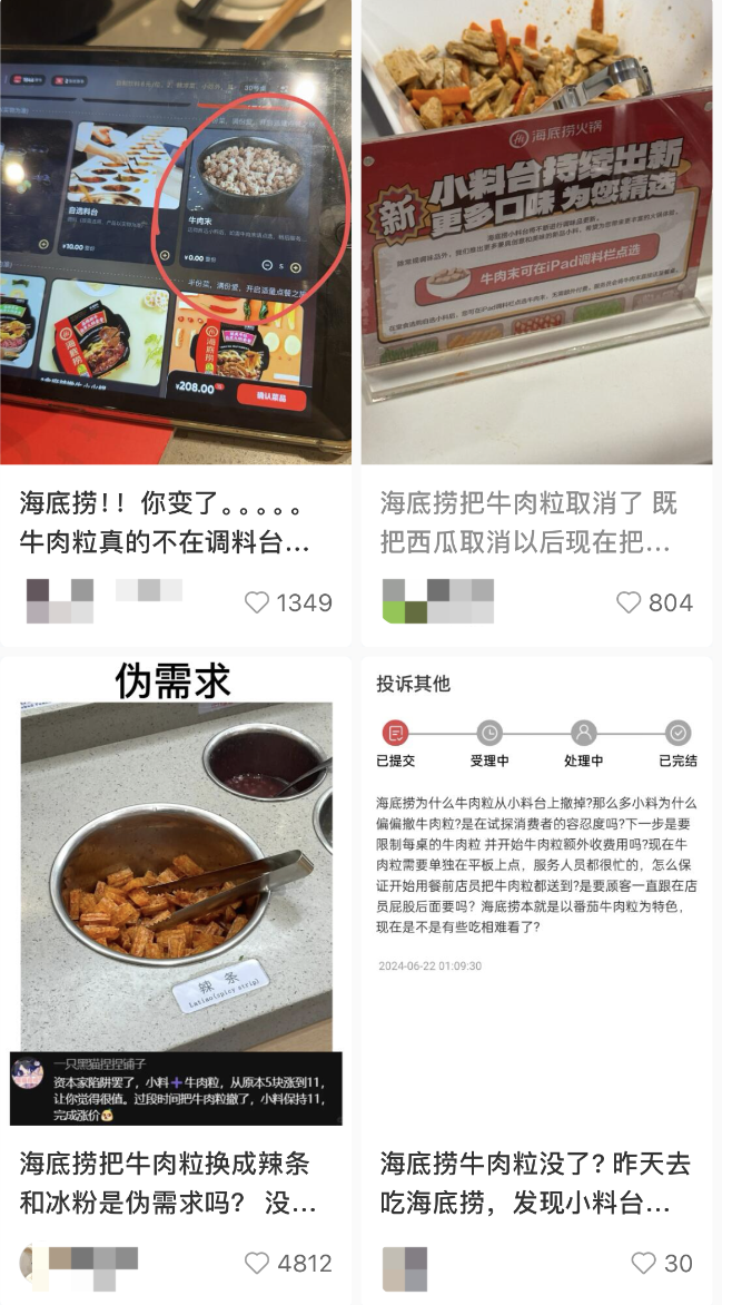 对此,海底捞官方客服表示,部分门店在小料台试点了新的产品,由于位置有限,所以将牛肉粒调整到iPad上面了。