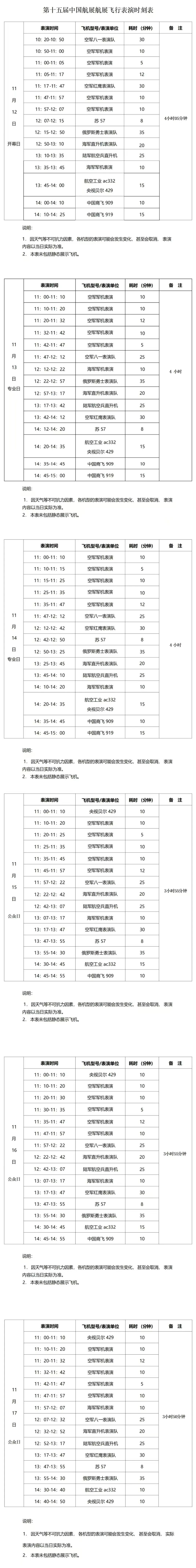 今天起,航展将每天安排约4个小时的飞行表演,其中歼-35A、歼-20以及俄罗斯苏-57三款隐身战斗机将首次同台。 本届航展上,我国陆海空军装备实现一体化展示,首次亮相的歼-15D舰载战斗机,首次展出的红-19地空导弹武器系统,以及新型察打一体无人机等装备将集中亮相。与此同时,昊龙货运航天飞机缩比模型、“虎鲸号”大型无人作战艇等一批明星展品也将在航展上首展首秀。 不仅战机云集,今天上午,在第十五届中国国际航空航天博览会上,中国商飞举行产品发布会,宣布ARJ21飞机增加商业名称C909,统一飞机产品名称为“商飞+型号”的形式。至此,中国商飞三款商用飞机产品名称分别为“商飞C909”“商飞C919”和“商飞C929”。 除了航展中心 珠海一所高校最近“出圈”了 那就是珠海科技学院 凭借优越的地理位置 在校师生不出校门就能 上下课的学生纷纷驻足 有网友评论称 “这招生视频绝了” 珠海国际航展中心 飞行表演时刻表 中国航展第二展区(斗门莲洲) 表演时刻表