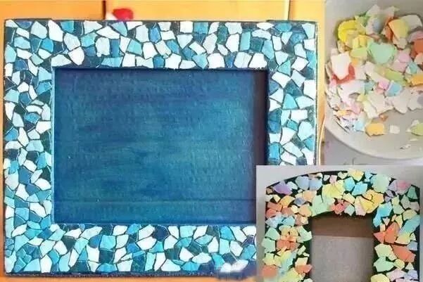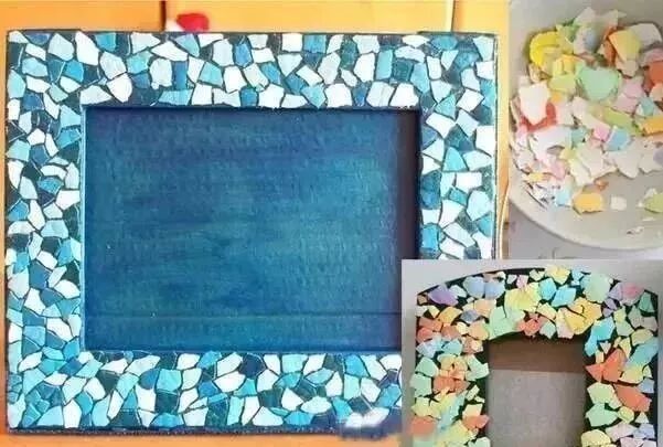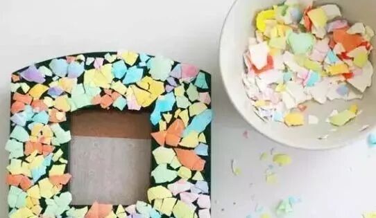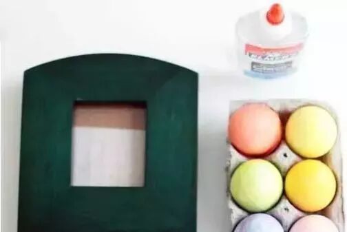 用胶水将这些彩色蛋壳固定在相框上,可以从一个角开始,随意一点没有规则地粘贴,尽量让蛋壳间只露出较少的间隙。