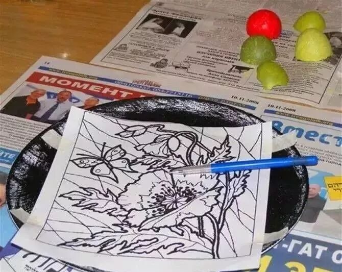 黑漆、清漆、砂皮、小刷子,蛋壳,镊子、毛笔,复写纸