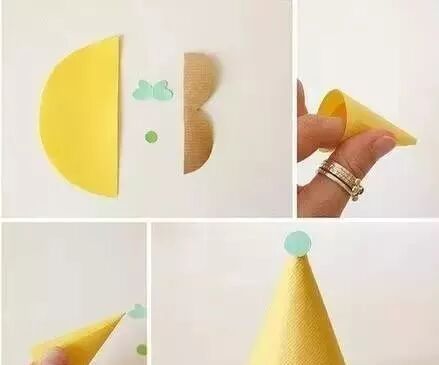 1. 用剪刀把彩色卡片剪成花瓣形,用胶水黏结成一个小帽子。