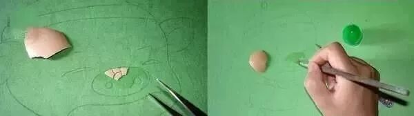 在底版上用毛笔小范围的涂清漆(透明漆),把蛋壳用镊子或者眉毛夹贴到底板上。