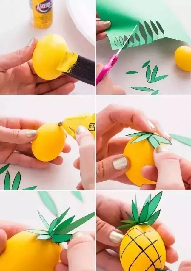 3.将菠萝叶依次粘贴在黄色鸡蛋顶端,并调整形状。