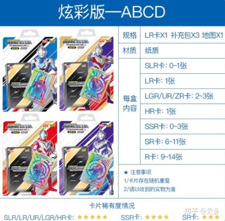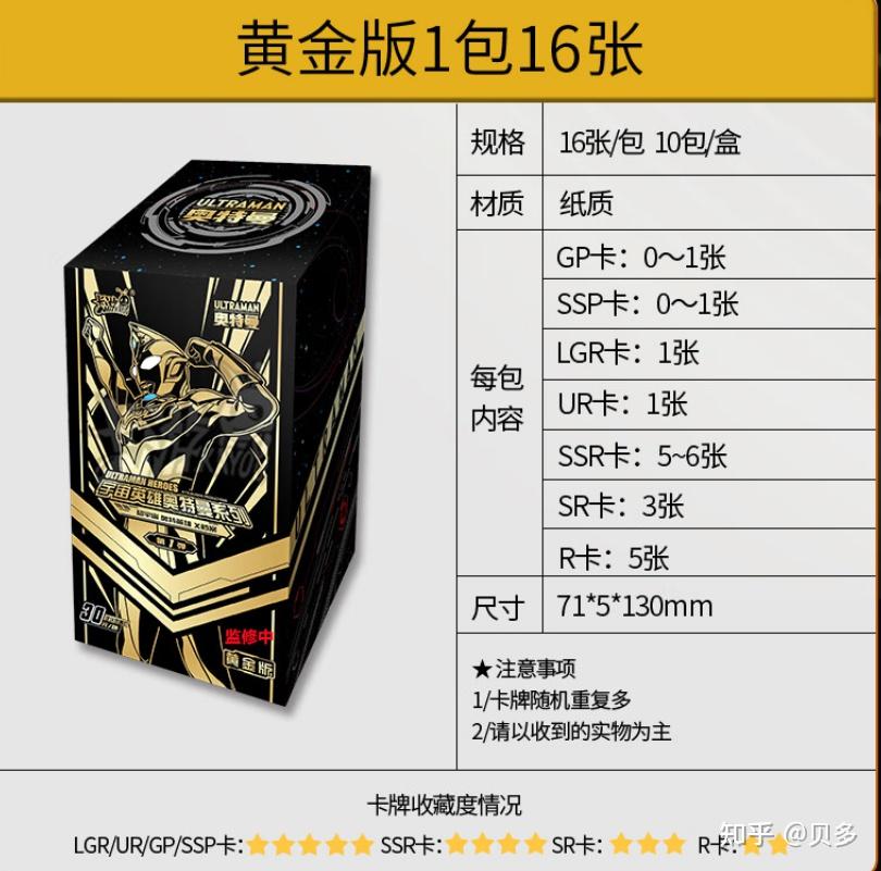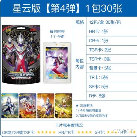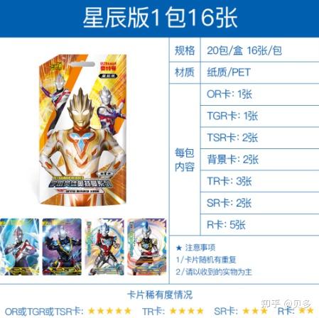 2023.01.04更新。适合想给孩子买卡片的家长或者想了解奥特曼卡片的商家阅读。 欢迎点赞关注收藏,追更。 主要攻略的是卡游公司出品的奥特曼卡片。全称是超宇宙奥特英雄X档案。它就是纸制品。 因为所在企业和工作性质的原因,接触了不少奥特曼卡片。算是对这种产品有一定认识。 很多家长对这种小朋友沉迷卡片的行为很是好奇。只要卡片没有涉及国家相关法律法规,作为家长,能够通过卡片拉近孩子的距离的方法,都是值得去了解。如果是商家也是有收获的。如果要在线上购买的话,优先建议是卡游在淘宝京东的官方店。 下面对各个产品进行说明 1元经典,2元豪华版,5元,10元属于经常更新的品种,2-3个月左右会更新一弹。一般是集中更新在各小学开学前的时间,可以参考线下各小学的文具店。适用人群一般是幼儿园到小学,基本到了五年级以上,自我觉醒后会有一定鉴别能力,知道爸妈赚钱不易。 给孩子买的话,尽量避开学校周边常销品种。黑钻,各类礼盒,卡游文具笔记本都可以。这种商品的选择很奇怪,虽说购买的主体是父母,但购买的最精准的建议居然是自己的孩子,因为他们太懂了。 R卡,这是一种最平常的等级的卡片,可以理解为没有任何印刷工艺的卡片,代表产品就是零售卖1元的经典版。 经典版外包装长这样,一整盒有36包(288张),每包含有7张普卡+1张闪卡,截止发文,已经更新到第29弹(可以理解为第几代),更新的周期大概是2-3个月左右。卡牌的工艺主要是闪卡、闪金、烫金工艺。 1元经典版这一系列特点是一包8张卡中只有1张可能是稀有卡,而稀有卡可能是SR/SSR/LGR/GP/UR 卡。由于价格便宜,出的稀有卡很少,基本上很多小朋友都是丢在地上的,1元估计买的是拆包的感觉。 所谓的满星卡,也是卡牌自带的星星颗粒数。10星为满星。但是大人的世界看的是卡牌等级,卡牌等级高的基本都是满星,所以基本不怎么讨论。 跟孩子讨论的重点是,这1元包里能出蓝GP。(GP是一个卡种,目前有蓝红紫三种。) 一盒30包,1包8张卡,每包卡牌入封模式为7+1,7张为R卡,1张为SR、SSR、UR、GP(18弹及以后)、SP随机。 这款豪华版的亮点是出SP卡,或者红GP卡。目前更新到第27弹,这一弹出终极塞罗闪耀型的SP是亮点。 跟孩子讨论的重点是,豪华版出SP卡。 这款奇迹版,5张卡牌/包、50包/盒。 每包含5张卡牌,3张为R卡,1张为SR卡,1张SR签名、SSR签名、LGR、OR、GP随机 目前出到第4弹,奇迹版R卡工艺有提升,特别漂亮。这个版本算是更新周期比较长的。 跟孩子讨论的重点是,这奇迹版出紫GP或者出OR卡。 5元传奇版开始出现稀有光刻工艺、奥特曼签名。每包卡牌入封模式为7+1,7张为R(闪)卡,1张为SR、SSR、 UR、USR随机。其中UR是光刻工艺。 8张卡牌/包、20包/盒。基本一盒都会出一张USR签名卡。目前出到传奇15弹。 跟孩子讨论的重点是,这传奇版出USR签名卡。(特别稀有的是出双签卡,即2种签名) 荣耀版卡牌工艺上主要是3D立体工艺、浮雕工艺、彩金艺术为特色。 10元/包。一盒18包。每包卡牌入封模式为1张HR/SHR随机,1张LGR/UR/ZR随机,2 张SR,0-1张SSR,3-4张R。 目前出到荣耀15弹,从14弹开始出SHR卡。 跟孩子讨论的重点是,这荣耀版出SHR卡/ZR卡,稀有卡的爆率不错。 小朋友口中的黑金卡,就是从CP包里面出的。首次为奥特曼绘制了黑金版本卡牌。每包必出CP黑金卡。 每包卡牌入封模式为16张卡,包含1张CP、1张HR、2-3张SSR、 4-5张SR、7张R。 跟孩子讨论的重点是,这CP包出黑金卡。 小朋友口中的透明卡就是从星辰版出的。塑料包。一包16张。必出OR卡。 主要出TR、TSR及TGR卡等透明卡,材质是PET材质。 跟孩子讨论的重点是,这星辰版出OR卡和透明卡。 透明卡喜欢的人很喜欢,不喜欢的人非常不喜欢。算是比较极端的卡种。 炫彩版是一片一片装的,里面是1张LR卡,1张对战地图、3包补充包。 LR卡就是表面那张卡。对战地图只是简单的一些规则,跟TCG英雄对决系列的产品不一样。 跟孩子讨论的重点是,这炫彩版出SLR卡。(不是必出的) 奥特曼的盲盒,一盒9个,里面就是1纸袋包装胸像印章+1X档案GMR卡。 产品内容:8个基础款,1个隐藏款或超级隐藏款;基础款共8种类,隐藏款共4种类,超级隐藏款共4种类。 跟孩子讨论的重点是,这款产品出一个印章和一张卡。 这一版的特点就是出3D电视卡,或者叫HR分镜卡。 每一包都带一个卡砖。卡砖主要起到保护,展示的作用。 必出XR卡,想要XR卡,黑钻就是最低价格的卡牌产品了。 市场上非常火爆。后面还出了一个黑钻礼盒。 基本常规的卡牌产品就到黑钻算是一个终结了,更高价格的产品基本上都是送礼的定位。 还有很多奇奇怪怪的产品,有时间更新 其他类版本 20元雷电版 雷电版有4款封面造型,特点是ur签名卡,就是封面的那张,其他基本没什么稀有卡。对的,就是买封面的那张。 一般是截止发文前一段时间的产品 每包含有16张卡牌,包含5张R卡,3张SR卡、5张SSR卡、1张UR卡、1张LGR卡、1张GP/SSP/SSR卡随机。 有概率出KR卡。 按往年情况下,先下手为强。此种商品给领导家孩子送礼比较合适,自己家孩子的话,就要慎重。 教育娃,尤其是难管教的娃,不要听专家的,以德服人不管用!小孩子是非观没建立,家长需要规范他们,怎么规范?说教有用还要XX干嘛?这个戒尺就是神器,订好规矩,用好戒尺,教育轻松多了,并且,效果也好极了。