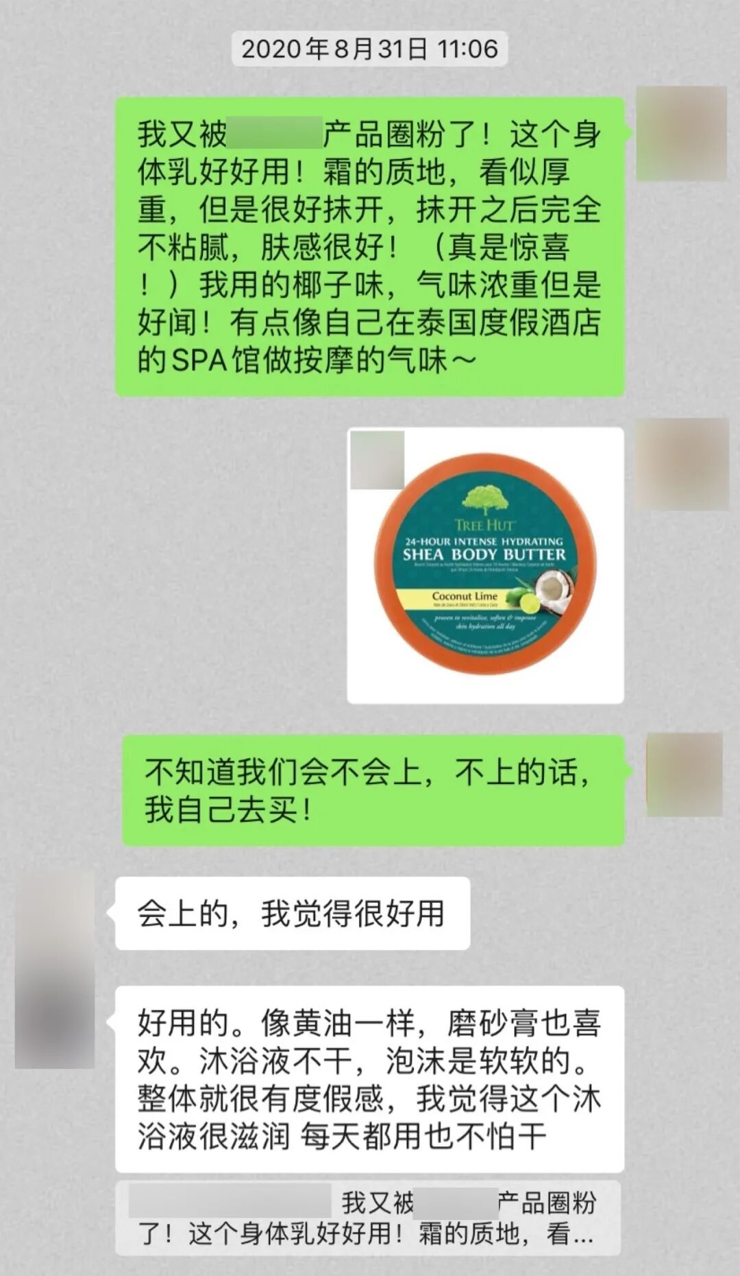 除了质地,它的特别之处还在于味道!椰子/芒果两种香型,浓郁却不刺鼻,轻轻按摩完,仿佛到达热带海岛做了个spa!别的身体乳、润肤霜的留香时间可能是按分钟、小时算的,它的留香时间能按天算,前一天晚上用,第二天早上还是能闻到完整清晰的香味,不只是若有若无的余香。