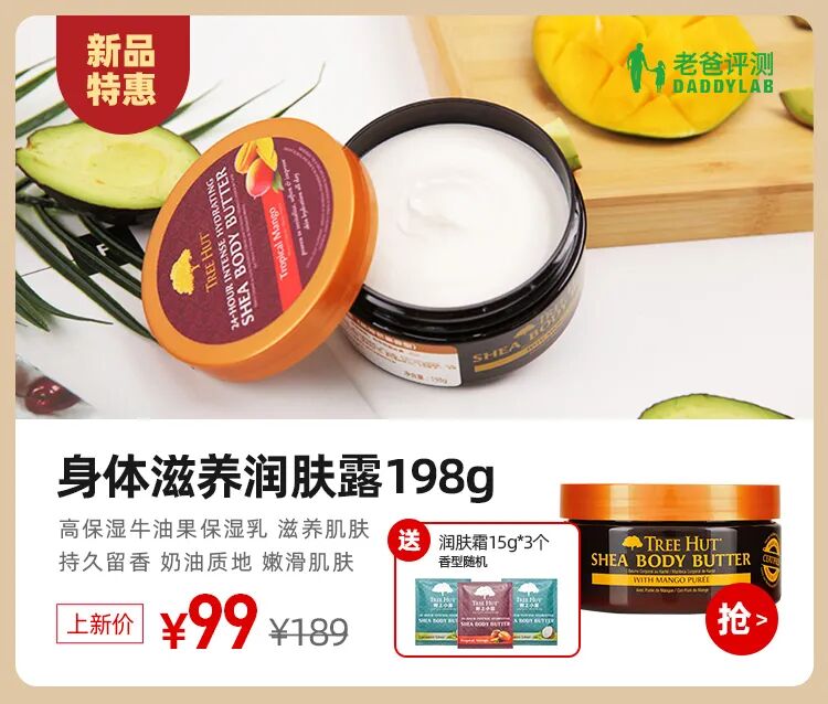 1、检测了重金属六项和微生物,结果均合格,以及风险物质甲醛、苯酚和邻苯二甲酸酯10项,均未检出;3、经检测12项防腐剂成分,苯氧乙醇含量 0.4815 %,山梨酸未检出,符合标签标识;4、这款润肤霜整体比较厚重,主要保湿成分为牛油果树果脂,产品中添加了一定量的香精,敏感肌肤注意做好过敏测试再使用。总而言之,喜欢身体乳自带香味的、且秋冬皮肤比较干,甚至会起皮、有蛇皮肤、鸡皮肤的小伙伴,你会喜欢这款润肤霜的,它的保湿性好、肤感棒、味道高级。原价189元,上新价99元,还赠送同款润肤霜小样15g*3个,小样方便带出门旅行时用,趁上新价??双十一活动的双重优惠,加入你的双十一购物车~
