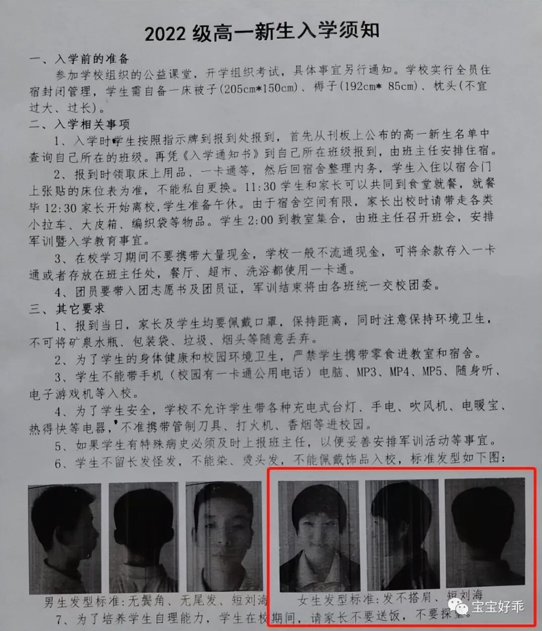 女生留长发很正常,可这所学校在高一新生入学通知中却明确要求女生需要剪短发,而这个短发的标准还不一般,需要严格按照入学通知上的发型标准来,头发不能过耳朵,前面的刘海也必须露出眉毛。