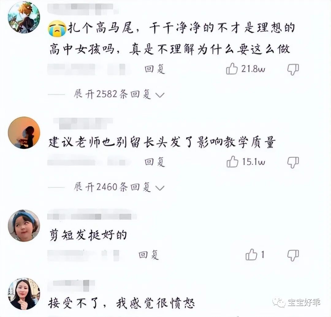 不少网友对学校强制女生剪超短发这件事纷纷表态,表示不理解,女生留着干干净净的马尾就很好,短发反而更不好打理,更浪费时间;还有网友觉得高中生正是青春的时候,为了学习努力是青春,留住美好的样子也是青春,强制学生剪一样的发型,这是在扼杀学生们的个性。