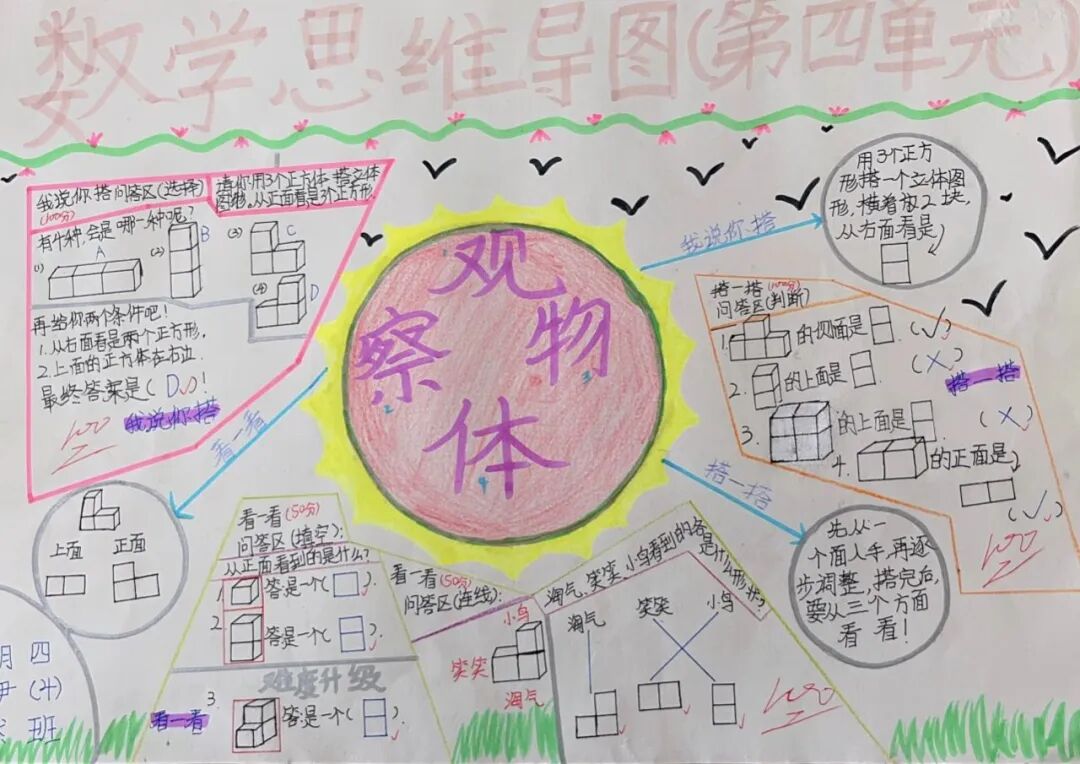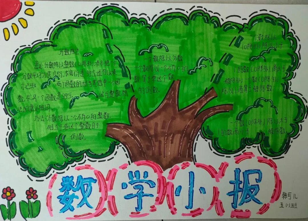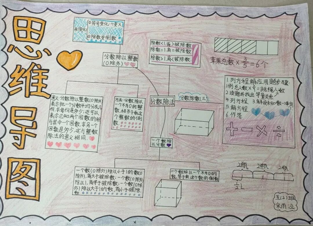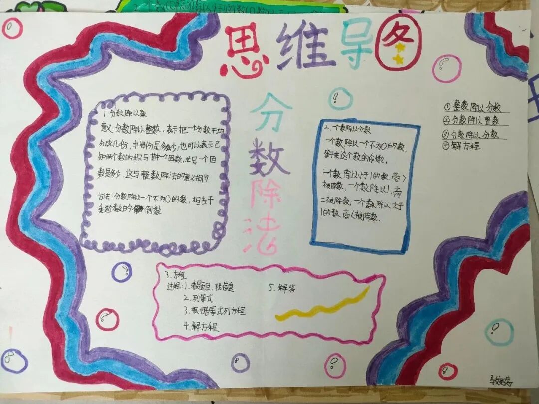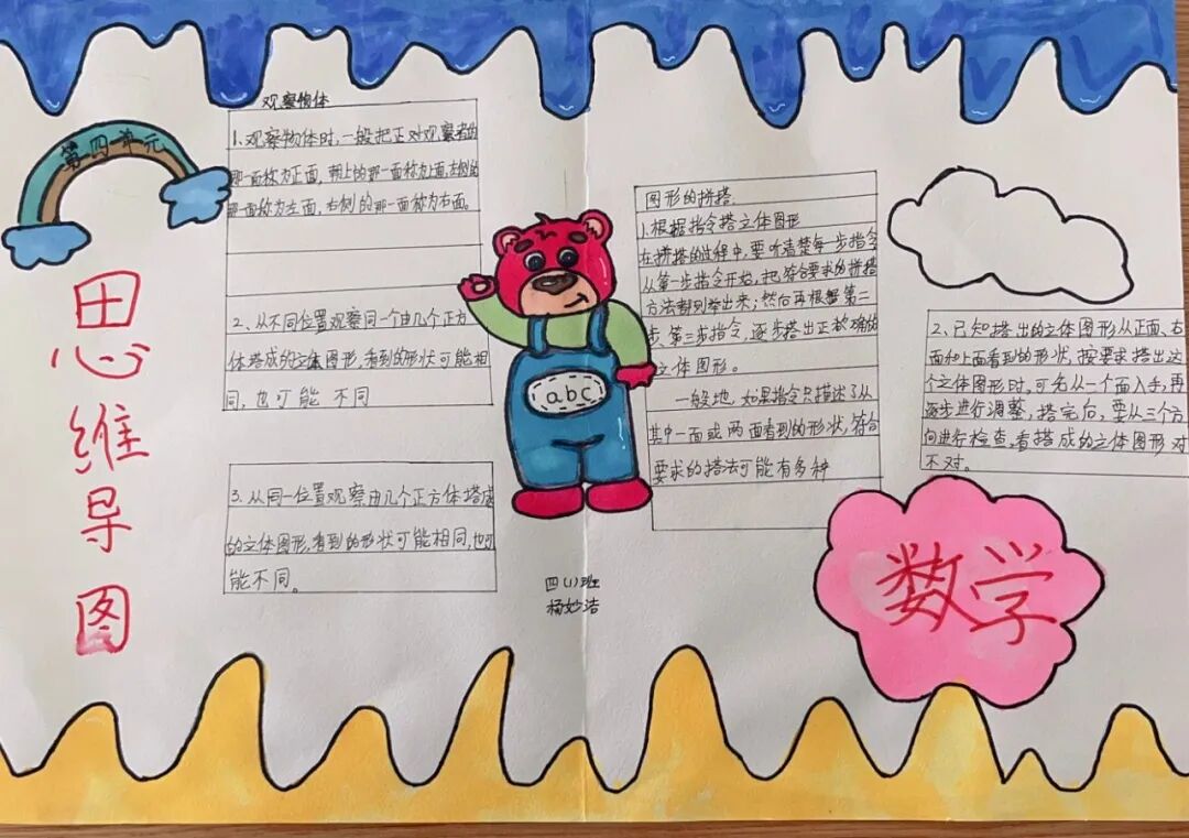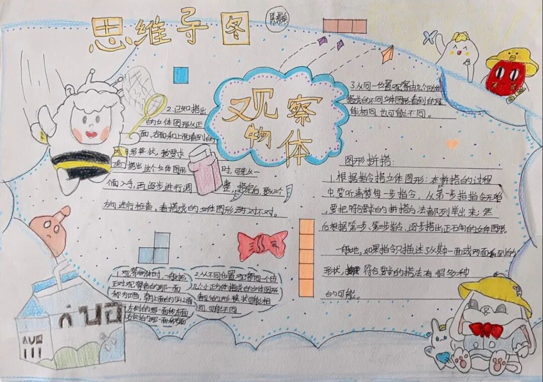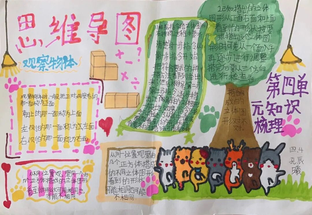 为落实学生数学学科核心素养的发展,提高学生的逻辑思维能力,激发学生学习数学的兴趣,让学生充分感受数学的魅力,每一个单元结束,学生都会绘制本单元的数学思维导图。 绘制思维导图,实际上是学生积极思考、主动进行创新实践的过程,同学们用关键词突出知识重点,深入挖掘知识内涵,发挥丰富的想象力,精心构画出一幅幅色彩鲜艳、富有创意、充满“数学味”的思维导图,将自己思维的过程动态地反映了出来。 下面就让我们一起欣赏他们的优秀作品吧! “观察物体”是北师大版数学教材四年级下册第四单元的教学内容,本单元其中包括看一看、我说你搭、搭一搭,学生利用思维导图梳理本单元重要的知识点,而且能进一步激发学生对观察“立体图形”的兴趣;让学会明白观察物体可以从不同的角度观察,不同的角度观察到的形状可能不同;还会从两个面观察到的图形,搭出原来图形的样子,会从给出任意一面,搭出不同样子的图形;学会把立体图形平面化,平面图形能够想象出原来的样子。为高年级图形空间想象能力的培养打下坚实的基础。 “分数除法”是北师大版数学教材五年级下册第五单元的教学内容,本单元学习的主要内容有:分数除以整数、分数除以分数、已知一个数的几分之几,求这个数的应用。这一单元主要是在分一分、算一算的活动中借助图形语言,利用已学过的分数乘法的意义,理解分数除法的意义,掌握分数除以整数、分数除以分数的计算方法,并能正确计算,解决实际问题。 一幅优秀的数学思维导图,不仅要色彩丰富、配图美观,更重要的是能科学地体现知识间的逻辑性。 学生们通过运用一些线条、符号、词汇和图像把一长串枯燥的信息,变成彩色的、容易记忆的、有高度组织性的图,张扬和充分体现个体思考的多样性,诉说着数学的魅力!见证了孩子们在学习中的收获与成长。 文字〡王欣 图片〡小学部 审核〡张贵涛 编辑〡杨芬 【一笔一世界 点滴筑未来】●《我的成长日记》![]()