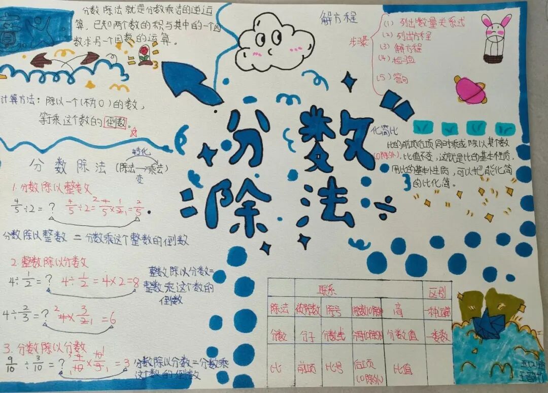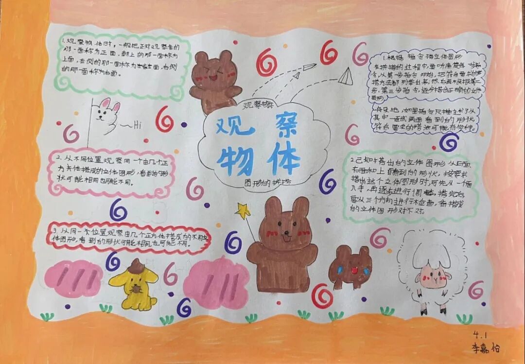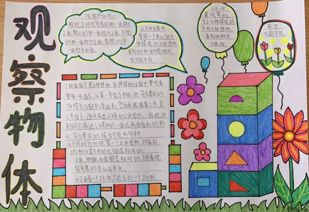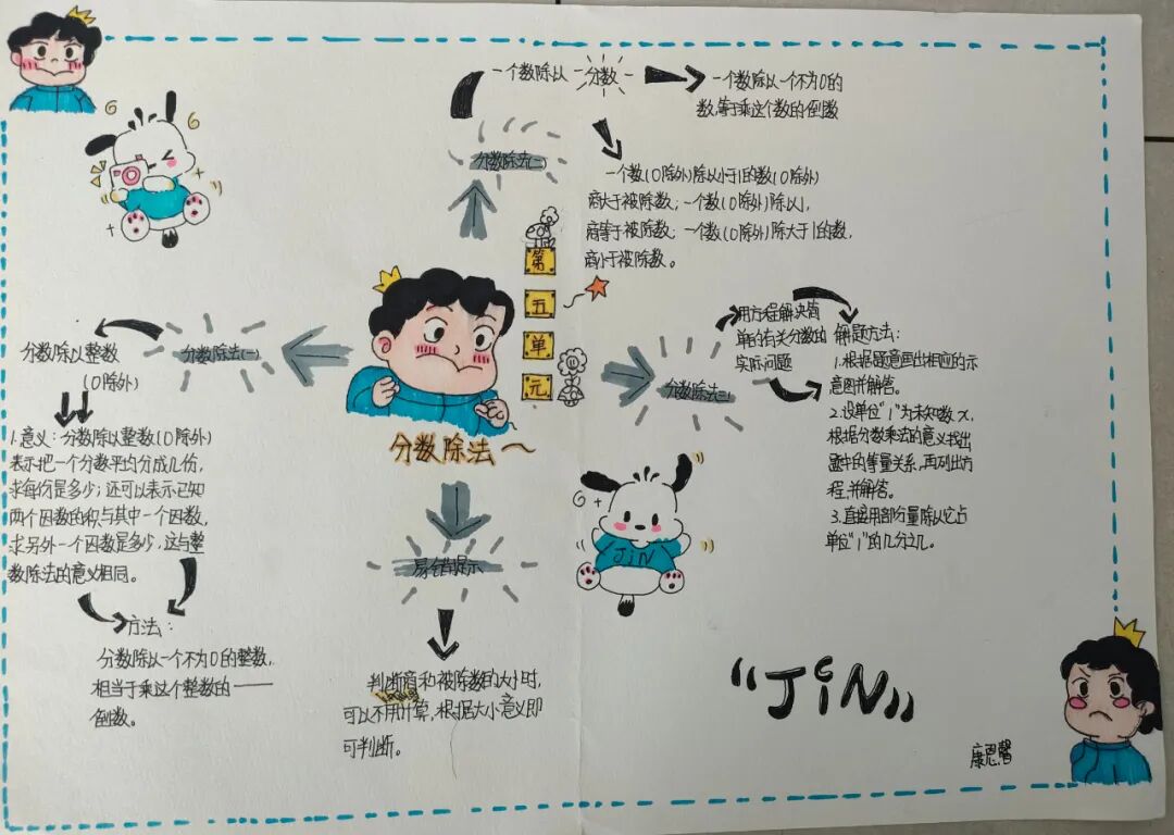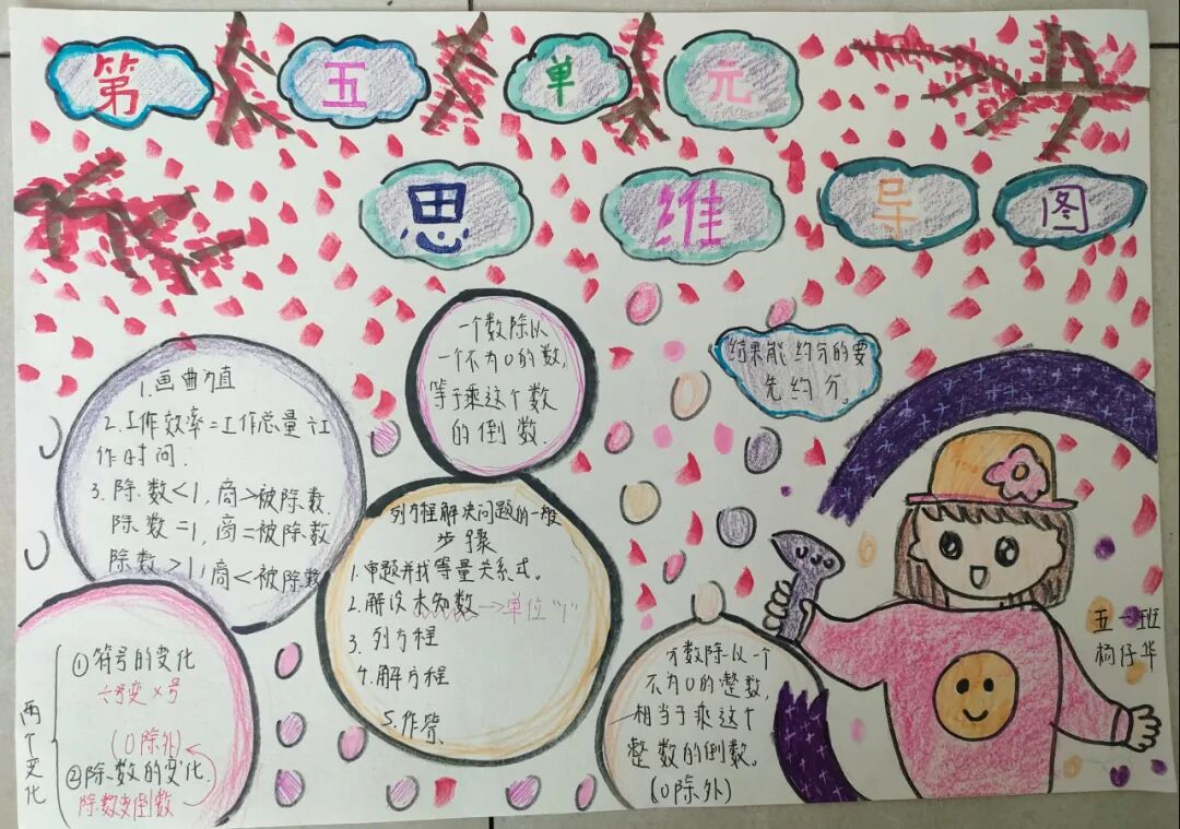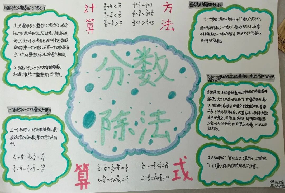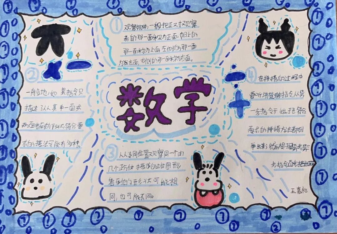 为落实学生数学学科核心素养的发展,提高学生的逻辑思维能力,激发学生学习数学的兴趣,让学生充分感受数学的魅力,每一个单元结束,学生都会绘制本单元的数学思维导图。 绘制思维导图,实际上是学生积极思考、主动进行创新实践的过程,同学们用关键词突出知识重点,深入挖掘知识内涵,发挥丰富的想象力,精心构画出一幅幅色彩鲜艳、富有创意、充满“数学味”的思维导图,将自己思维的过程动态地反映了出来。 下面就让我们一起欣赏他们的优秀作品吧! “观察物体”是北师大版数学教材四年级下册第四单元的教学内容,本单元其中包括看一看、我说你搭、搭一搭,学生利用思维导图梳理本单元重要的知识点,而且能进一步激发学生对观察“立体图形”的兴趣;让学会明白观察物体可以从不同的角度观察,不同的角度观察到的形状可能不同;还会从两个面观察到的图形,搭出原来图形的样子,会从给出任意一面,搭出不同样子的图形;学会把立体图形平面化,平面图形能够想象出原来的样子。为高年级图形空间想象能力的培养打下坚实的基础。 “分数除法”是北师大版数学教材五年级下册第五单元的教学内容,本单元学习的主要内容有:分数除以整数、分数除以分数、已知一个数的几分之几,求这个数的应用。这一单元主要是在分一分、算一算的活动中借助图形语言,利用已学过的分数乘法的意义,理解分数除法的意义,掌握分数除以整数、分数除以分数的计算方法,并能正确计算,解决实际问题。 一幅优秀的数学思维导图,不仅要色彩丰富、配图美观,更重要的是能科学地体现知识间的逻辑性。 学生们通过运用一些线条、符号、词汇和图像把一长串枯燥的信息,变成彩色的、容易记忆的、有高度组织性的图,张扬和充分体现个体思考的多样性,诉说着数学的魅力!见证了孩子们在学习中的收获与成长。 文字〡王欣 图片〡小学部 审核〡张贵涛 编辑〡杨芬 【一笔一世界 点滴筑未来】●《我的成长日记》![]()