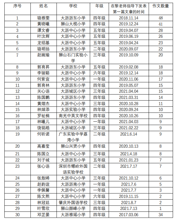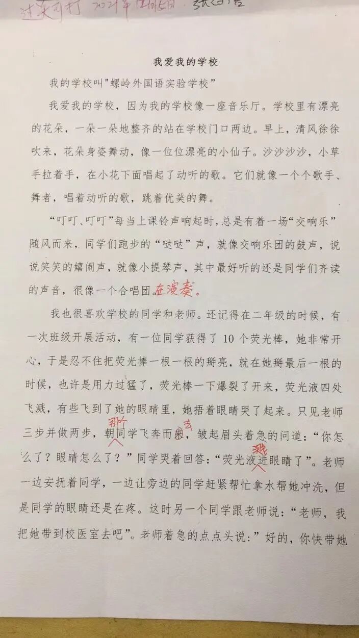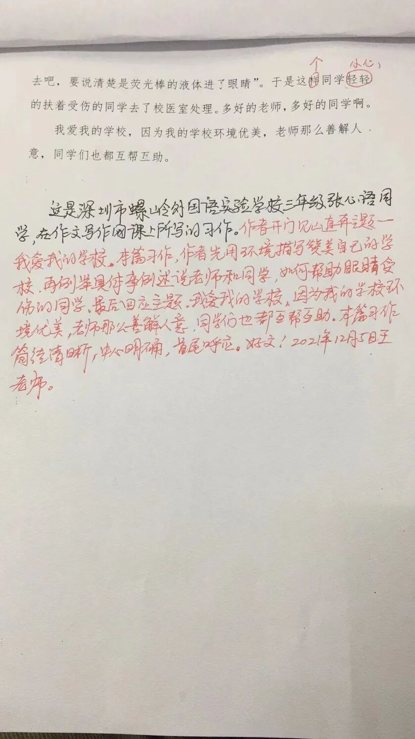 点击蓝字 · 关注我们 张心语 张心语于2021年7月17日发表了第一篇文章 已经跟着黎老师学习作文145天 这是张心语近一年内 第8篇作文 我爱我的学校 深圳市螺岭外国语实验学校 三年级 张心语 我的学校叫"螺岭外国语实验学校” 我爱我的学校,因为我的学校像一座音乐厅。学校里有漂亮的花朵,一朵一朵地整齐的站在学校门口两边。早上,清风徐徐吹来,花朵身姿舞动,像一位位漂亮的小仙子。沙沙沙沙,小草手拉着手,在小花下面唱起了动听的歌。它们就像一个个歌手、舞者,唱着动听的歌,跳着优美的舞。 “叮叮、叮叮”每当上课铃声响起时,总是有着一场“交响乐”随风而来,同学们跑步的“哒哒”声, 我也很喜欢学校的同学和老师。还记得在二年级的时候,有一次班级开展活动,有一位同学获得了10个荧光棒,她非常开心,于是忍不住把荧光棒一根一根的掰亮,就在她掰最后一根的时候,也许是用力过猛了,荧光棒一下爆裂了开来,荧光液四处飞溅,有些飞到了她的眼睛里,她捂着眼睛哭了起来。只见老师三步并做两步,朝那个同学飞奔而去,皱起眉头着急的问道:“你怎么了?眼睛怎么了?”同学哭着回答:“荧光液进眼睛了”。老师一边安抚着同学,一边让旁边的同学赶紧帮忙拿水帮她冲洗,但是同学的眼睛还是在疼。这时另一个同学跟老师说:“老师,我把她带到校医室去吧”。老师着急的点点头说:”好的,你快带她去吧,要说清楚是荧光棒的液体进了眼睛”。于是这母同学轻轻的扶着受伤的同学去了校医室处理。多好的老师,多好的同学啊。 我爱我的学校,因为我的学校环境优美,老师那么善解人意,同学们也都互帮互助。 这是小作者张心语同学?? 王老师 这是深圳市螺岭外国语实验学校三年级张心语同学,在作文写作网课上所写的习作。作者开门见山直奔主题一一我爱我的学校。本篇习作,作者先用环境描写赞美自己的学校,再例举具体事例述说老师和同学,如何帮助眼睛受伤的同学,最后回应主题。我爱我的学校,因为我的学校环境优美,老师那么善解人意,同学们也都互帮互助。本篇习作,简结清晰,中心明确,首尾相应。好文!2021年12月5日王老师。 张心语近一年内2019年3月29日-2021年12月7日发表作文7篇,获得奖状0张: 作文共7篇: 黎老师教小学作文|三年级·张心语《月亮冰淇淋》2021-11-11 黎老师教小学作文|三年级·张心语《我眼中的程老师》2021-10-7 黎老师教小学作文|二年级·张心语《猜猜他是谁》2021-9-14 黎老师教小学作文|二年级·张心语《生日》2021-9-7 黎老师教小学作文|二年级·张心语《猜猜她是谁》2021-8-21 黎老师教小学作文|二年级·张心语《荷花》2021-7-28 黎老师教小学作文|二年级·张心语《猫和老鼠》2021-7-17 奖状共0张: 黎老师教学心得|抓紧时间,好好学习,打牢基础,未来才可以越学越好,成为参天大树,为家庭和社会做贡献! 黎老师教学心得|“巧妇难为无米之炊”,平时一定要多读多背!现在的课程会根据期末考试进行特定的训练,同学们也为寒假的学习做好准备! 黎老师教学心得|名校的资源是普通学校无法比的,做学霸、进名校不难,但是要坚持下去也不容易,希望我们大家都要坚持! 黎老师教学心得|学有余力的同学更应该抓紧时间做练习!未来才会越学越好! 黎老师教学心得|学会向人家求助,我们要学会站在巨人的肩膀上,眺望更高的地方,更远的目标,这才是人生的道理! 黎老师教学心得|学霸就是你和我,关键是你有没有将学习刻在你的脑子里,请同学们不要浪费时间。抓住每天的时间你就可以成为学霸! 黎老师教学心得|只要功夫深,铁杵磨成针,就是背书这么点小事,难得过我们这些聪明的孩子吗?希望大家要重视这个背诵的问题! 黎老师教学心得|家长就是孩子的一面镜子,要给孩子做好榜样,学习遇到困难要敢于去面对,才能解决! 78人发表890篇:开心补习社最新作文发表排行榜 开心补习社学员作文发表统计表(按作文发表数量多少顺序) 统计时间:2021年12月1日 黎老师教小学作文课程简介 从2017年开始,截止到2021年12月1日,黎老师王老师已经辅导学生写出了890篇优秀的文章。学好作文收益很大。学好作文收益很大。上大学以后考公务员需要写申论,我们走上职场也一样要写文章,大学生的研究生论文写作也一样需要你深厚的作文功底。学生从小就要开始写作文,小学基础能打好,以后写作文就可以水到渠成。选择黎老师教小学作文,可以帮助你打好写作文的基础,会写作文,写好作文。 黎老师教小学作文的优势有: 1、专家执教。 1)黎老师王老师教学经验、心理辅导经验丰富; 2)黎老师王老师授课内容精细,课程内容梯度根据孩子的学习情况和性格特点进行个性化设置,帮助孩子巩固学校所学的不理解、不牢固的易错点和难点知识; 3)黎老师王老师批改作业,同学可以随时在微信上与黎老师王老师交流指导,实际辅导时间比计划规定辅导时间要多,物超所值。 2、成绩过硬。黎老师长期在小学教育一线,教学经验丰富,教学思维超前,育人成果突出,所辅导的学生提分效果显著,学员喜报频传。经过寒假黎老师线上辅导的孩子们,都写出了好文章。特别是骆雅雯同学所写的读后感,已达到参赛水平。 3、理论方法成体系。立足20年的一线教学心得,黎老师结合自己多年的写作经验,博采众长,由易到难,循序渐进,讲深讲透,手把手、系统地教给孩子写作方法技巧,以帮助