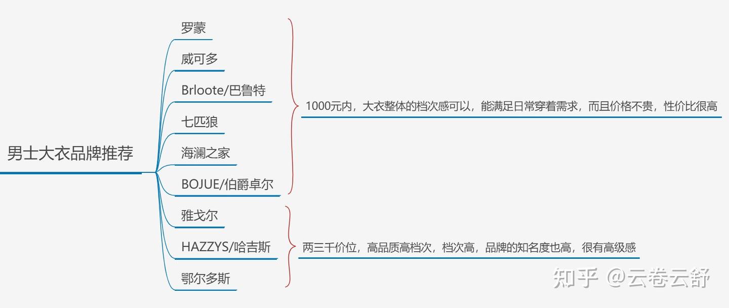 要说秋冬外套必备,对于男士而言,不过这三件——大衣、风衣、羽绒服!当然,这三件也在大家的衣橱中占着很重要的位置 今天我们先来说说大衣,大衣,不可缺少的衣橱单品,穿起来不仅保暖,还能凸显时尚感,展示绅士的气质感,而且一件高品质的大衣,还能穿出正装感,妥妥的精英范,而且大衣质量好的话,穿个几年几十年都没问题 所以说,男士的衣服在于精而不在于多,不管哪个年龄段的男士,拥有一件合身的大衣都是很重要的 整篇文章会从以下几个部分展开: 那话不多说,我们开始进入正文吧! 大衣的款式非常多,而且各种各样的颜色,价位上也是各种差距,所以想选一件合适的大衣,你可以从这四个方面入手:版型、面料、长度以及品牌,那我们每个方面具体来看看! 第一点:根据身材选版型 男款大衣的版型主要有:H型、Y型、O型、X型 H型大衣:H型剪裁的男士大衣可以说是完全无风险的,几乎各种身形都适合,比较显身材,而且穿起来很正很有气质,一般韩剧里男主的大衣穿搭都是H型的 Y型大衣:Y型的剪裁也是比较百搭的款式,适合倒三角身材,能达到修身的效果 O型大衣:oversize宽松版型,穿起来有一种慵懒感,比较适合年轻男士 X型大衣:也就是有收腰设计的大衣,适合比较瘦且有腰的身材,X型收腰其实很容易穿的土土的,现在选的人不多了,更适合风衣的款式 第二点:根据预算选面料 材质面料对于挑选一件好的大衣来讲,还是很重要的,我们所说的大衣通常就是代表毛呢大衣,目前市面上主要的面料有四种:人工纤维、羊毛材质、羊绒材质、羊驼毛 这四种面料通过图片,直观上就能感受到质感的差别: 人造纤维:是最便宜的面料,质感比较差,穿起来的效果也一般,如果学生党预算低可以考虑,一般不建议; 羊毛:比较常见的就是羊毛大衣了,品质好,而且价格相对来讲不是很贵,不过羊毛也要看含量,含量越高质量越好,价位一般也是根据羊毛含量体现的,是我们日常选择最多的; 羊绒:男士大衣搭配相对羊毛来讲会更暖和,而且更轻,不过价格也相对贵一些,市面上大多采用羊毛羊绒混纺材质,羊绒含量越高,保暖性越好,品质也更好; 羊驼毛:如果再好再贵的话就是羊驼毛了,真正出自羊驼身上的毛,保暖性、舒适度方面都很好,不过价格也很贵,现在市面上也有一些好的大衣是羊毛+羊驼毛混纺的。 第三点:根据身高选长度 选对大衣的长度也是重要的一点,大衣的长度有短款、中长款和长款,一般建议根据身高选择合适的长度 短款:属于常规款,长度到臀部左右,不管什么身高短款都适合,身高在170cm以下的 中长款:长度在膝盖和臀部之间,不超过膝盖,170cm以上的男士都可以选 长款:长度在膝盖以下,更建议身高180cm以上的选择,能凸显身高,180以下很难撑的起来 第四点:根据价格选品牌 品牌也是不可忽视的一点,不同价位都有不错的大衣品牌,可以根据你的预算和能接受的价格来选 接下来就是不同品牌的大衣了,我推荐的这些大衣,从款式、面料和价格方面相对都是很不错的,各个价位都有,选择性很多,值得你好好挑选,可以根据自己的预算、自己的偏好来选择! 这个价位很便宜,主要是那些男装的各种潮店铺,我就不给大家推荐那些,虽然款式多但是质量相对比较差…… 我以基础款为主,给大家推荐一个不错的牌子,罗蒙,它家的西装正装蛮火的,这款大衣的性价比很高,500不到的价格,羊毛呢面料,款式适合年轻人,质量也很不错 罗蒙 罗蒙在设计上的版型很正,这款大衣羊毛面料,挺括修身,休闲商务都适合,预算不高的选这款就行了。 这个价位的大衣品质上就挺不错了,以羊毛材质为主,大衣整体的档次感可以,保暖性、舒适性好,能满足日常穿着需求,而且价格不算贵,性价比很高 威可多 威可多是千元价位里我最推荐的品牌了,这个品牌非常讲究设计感,而且风格上偏时尚化,能够满足不同年龄段的需求,目前非常受欢迎 这款大衣H版型,不挑身材,采用的是羊毛混纺面料,面料舒适,经典平驳领,优雅大气,衣服整体很有型,而且价格不高,性价比很不错。 威可多的大衣我主推这款,版型设计穿起来真的太显气质了,就是那种随意中而不自知的气质,西装领很正,整体满满的商务绅士感,非常推荐! Brloote/巴鲁特 说实话这个牌子我之前不知道,是我准备写这篇文章时,跟身边的男性朋友调研,发现大家都推荐,属实是我孤陋寡闻了…… 巴鲁特是英国的男装品牌,走的轻奢路线,也就是高级且不贵,在做工、细节上会更加出色一些 这款大衣的性价比真的很高了,采用的优质羊毛面料,品质工艺加工制作而成的羊毛呢,外表厚重,但穿起来轻薄,而且触感柔软舒适,整体设计简洁大方,这个价位100%的羊毛,看中品质的男士不要错过! 海澜之家 海澜之家这个品牌不用多说了,男人的衣柜嘛,推荐这款大衣的原因是它有可拆卸的内胆外套,那就很实用了,冷点热点都能穿,款式也是比较大方的,可以考虑。 这个价位的大衣都是高品质了,一般都在两三千左右,以羊毛羊绒混纺面料为主,质量非常好,档次高,品牌的知名度也高,穿起来很高级,如果预算够的朋友,绝对值得考虑 雅戈尔 雅戈尔是国内知名的男装品牌,档次高,而且品质很高,品质和工艺都是被大众所认可的,它家的大衣都采用的羊毛羊绒混纺,手感更加柔顺,穿起来的保暖性、舒适性也更好 这款大衣就是很正的H型版型,简约大方,剪裁得体,穿起来很厚实又很有高级感。 还有这款,设计上