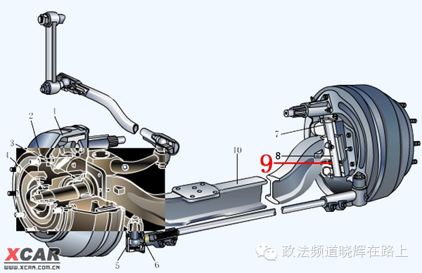 那么汽车的主销是什么样的呢? 下图中的红色数字“9”指的就是主销,前轮就是以它为中心来转向的。