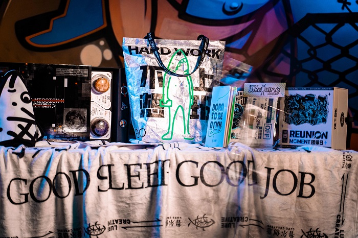 意起互动将gather-digital logo上那恰如满月的圆形,结合专属的黄色,在盛满心意的礼包上,升起一轮皓月。而明月照耀下的一捧绿植象征生机、一组咖啡寓意振奋,犹如意起互动的一份邀请 ——愿共赴前程,让创意不息。