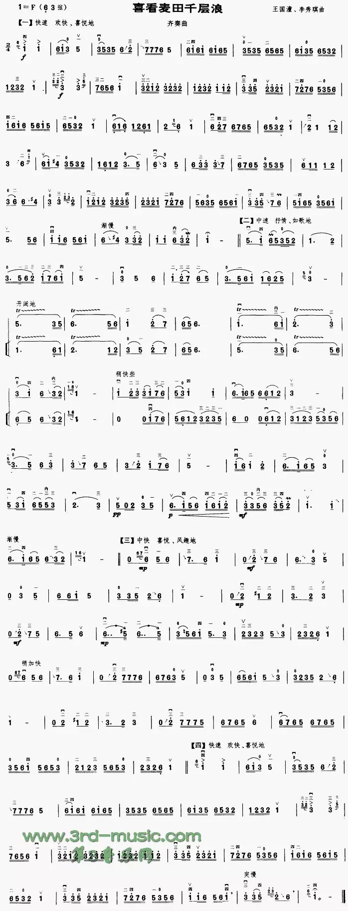 二胡曲《喜看麦田千层浪》,王国潼、李秀琪曲,该曲在20世纪70年代问世后曾风靡于中国大陆。这是一首河北音乐风格的二胡作品,乐曲呈现了农村丰收的景象及农民辛勤劳动后迎来丰收时的喜悦心情。
