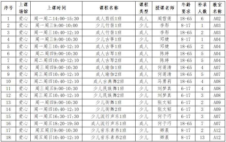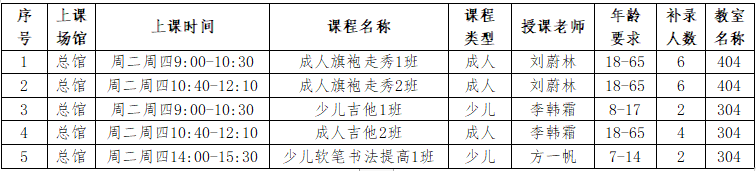 开课后因不愿意继续学、不适合学习等主观因素导致的请假超过3次或无故旷课2次及以上的学员我馆将视为您自动放弃学习机会,同时在未来1年内将无法参与其他公益课程的报名; 6. 在课前,如遇身体不适等异常情况,请提前向任课老师或教务老师请假;在课中,如遇身体不适等异常情况,请立即向任课老师说明情况。 摄图网_402143483 (上下滑动查看详情) 总馆 1. 少儿软笔书法提高班 上课老师:方一帆 上课地点:总馆·304 学员要求:7-14岁,有一年以上学习基础,由学员监护人提交报名 自备学习资料:水杯、毛毡、毛笔、墨盘、笔架、大米字格 2. 成人旗袍走秀基础班 上课老师:刘蔚林 上课地点:总馆·404 学员要求:18-65岁,有无基础均可,学员自主报名 自备学习资料:水杯、黑色舞蹈服、旗袍,黑色高跟鞋 3. 少儿、成人吉他基础班 上课老师:李韩霜 上课地点:成人尤克里里基础班:总馆·304 学员要求:少儿8-17岁、成人18-65岁,有无基础均可,少儿由该学员监护人提交报名、成人学员自主报名 自备学习资料:水杯、吉他 爱心分馆 1. 成人非遗剪纸基础班 上课老师:周雪莲 上课地点:爱心分馆·A02 学员要求:成人18-65岁,有无基础均可,成人学员自主报名 自备学习资料:水杯、铅笔、橡皮擦、剪刀、胶棒、红纸尺寸29mX42cm、白纸29cmX42cm 2. 少儿/成人古筝基础班 上课老师:邓婕 上课地点:爱心分馆·A04 学员要求:少儿8-17岁/成人18-65岁, 有无基础均可,少儿由该学员监护人提交报名、成人学员自主报名 自备学习资料:古筝指甲、古筝专用胶布、水杯 3. 成人古典舞基础班 上课老师:马勇莉 上课地点:爱心分馆·A08 学员要求:18-65岁,有无基础均可,学员自主报名 自备学习资料:水杯、舞蹈服、舞蹈鞋 4. 成人古琴基础班 上课老师:陈婷 上课地点:爱心分馆·A04 学员要求:18-65岁,有无基础均可,学员自主报名 自备学习资料:水杯、笔、笔记本 5. 少儿街舞基础 上课老师:张文韬 上课地点:爱心分馆·A09 学员要求:6-17岁,有无基础均可,由学员监护人报名 自备学习资料:水杯、运动服装、运动鞋 6. 成人瑜伽基础班 上课老师:何莲清 上课地点:爱心分馆·A07 学员要求:18-65岁,有无基础均可,学员自主报名 自备学习资料:水杯、瑜伽垫 7. 少儿/成人流行声乐基础 上课老师:何于巧 上课地点:爱心分馆·A12 学员要求:少儿6-17岁/成人18-65岁;有无基础均可,由学员监护人提交报名 自备学习资料:水杯 8. 少儿/成人竹笛基础班 上课老师:李彤 上课地点:爱心分馆·A03 学员要求:少儿8-17岁/成人18-65岁,有无基础均可,由学员监护人提交报名 自备学习资料:水杯、竹笛、笛膜、笛膜胶 9. 少儿音乐基础素养 上课老师:卿晨 上课地点:爱心分馆·A12 学员要求:8-17岁,有无基础均可,由学员监护人提交报名 自备学习资料:水杯、五线谱本、铅笔、橡皮擦 10. 少儿民族舞基础班 上课老师:刘梦真 上课地点:爱心分馆·A08 学员要求:6-17岁,有无基础均可,由学员监护人报名 自备学习资料:水杯、舞蹈服、舞蹈鞋 11. 少儿古典舞基础班 上课老师:马勇莉 上课地点:爱心分馆·A08 学员要求:6-17岁,有无基础均可,由学员监护人报名 自备学习资料:水杯、舞蹈服、舞蹈鞋 黄水镇 1. 少儿创意画 上课老师:胡娟 上课地点:双流区黄水镇文武小区二楼会议室 学员要求:6-17岁,有无基础均可,由学员监护人报名 自备学习资料:水杯、铅笔、黑色勾线笔、橡皮擦、8开素描纸、12色以上马克笔或丙烯马克笔 如果还有更多疑问 可以扫描下方二维码 添加本地宝小编一对一咨询 另外还能加入成都办事交流群 和成都的各位群友 交流成都居住证办理 公积金提取、落户、上学等 民生办事经验、办理地点 END 右下角点个“在看” 芃芜工资涨一毛! 成都本地宝每天都为您带来本地民生资讯! 投稿 & 合作 & 建议 & 联系 合作QQ | 4009999087(注:手机QQ添加时,若无法找到,请选择“找公众号”即可添加) 合作电话:400-9999-087 点击查看:合作微信 本文由成都本地宝编辑整理发布 素材来源:成都双流区文化馆、本地宝综合 如涉及侵权或对版权有疑问 请邮件联系wwjuan@bendibao.com删除处理 编辑:芃芜 插图:摄图网、图虫网 右下角点个“在看” 小编的工资涨1毛! ▼ 点击阅读原文,进入成都活动专题