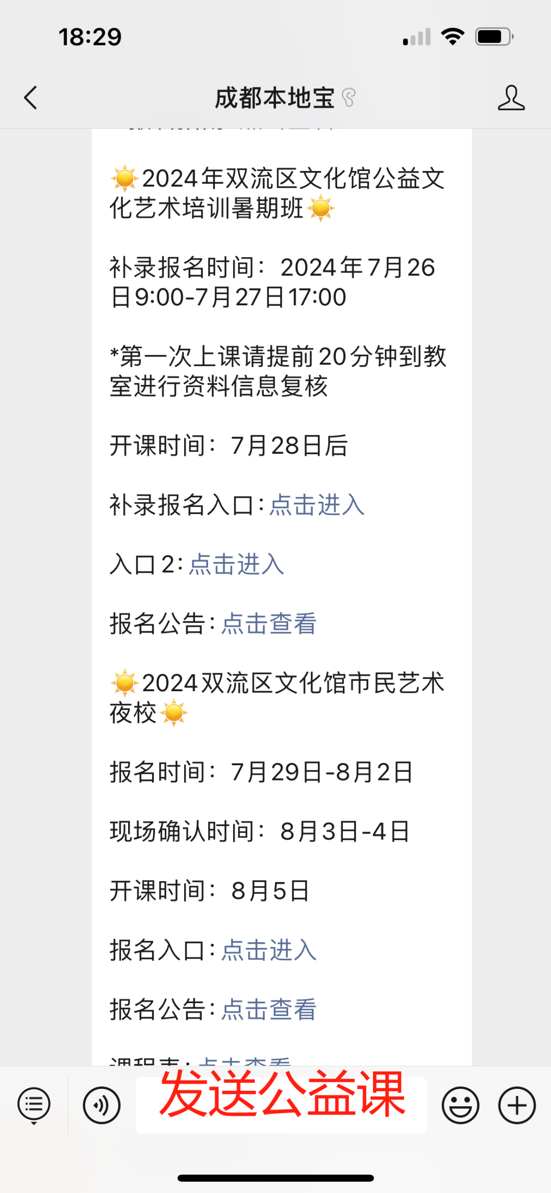 成都市双流区 2024公益文化艺术培训 暑假班开始补录 学习课程多样 涉及非遗剪纸、民族舞、古筝 吉他、古琴、瑜伽…… 大人、小孩都能学习 名额有限,抓紧时间报名! ↓↓↓ 2024年7月26日9:00-7月27日17:00 方式1:关注“成都市双流区文化馆”微信公众号→预约报名→课程报名→选择对应场馆以及相应课程报名即可。 方式2:下载并登录“文化天府”APP→选择“双流”地区→课程报名→选择对应场馆以及相应课程报名即可。 成都市双流区文化馆公众号 进入【成都本地宝】公众号 在对话框回复【公益课】 获取补录报名入口、课程安排、报名要求 更多区县免费公益培训活动 ★特别提醒: 文化馆公益课程报名均为实名制,首次参加报名的用户,请先到“用户个人中心(成都市双流区文化馆公众号菜单栏-文化双流-个人中心)”完善信息资料后,方可报名。 (一)审核时间及地点: 第一次上课请提前20分钟到教室进行资料信息复核,总馆上课的成人及少儿学员在区文化馆总馆一楼钢琴房106(淳化街93号)进行资料审核,爱心直属分馆上课的成人及少儿学员到区文化馆爱心公园直属分馆处审核。 (二)审核资料及签订安全协议: 审核资料时请提交一份本人身份证复印件或户口本复印件,现场签订“双流区文化馆公益文化艺术培训学员(家长)安全承诺书”,少儿由家长或其他监护人代签。 (三)扫码加入微信教学群: 现场审核通过的学员,再次核对姓名,电话等基本信息后扫码进入教学群。 摄图网_501810358 区文化馆公益文化艺术培训项目为基础班、提高班。每位学员最多报 2 门培训课程。 少儿班报名年龄为6岁-17岁(少儿乐器音乐类如:少儿古筝、少儿竹笛、少儿吉他、少儿音乐基础素养建议报名年龄为8岁-17岁); 成人班报名年龄为18-65岁。 成都古筝参加培训的少儿学员在培训过程中,须由家长接送,否则将取消本期培训资格。 本期培训免费,不收取学员任何费用。 7月28日后根据课程安排的上课时间进行上课 双流区文化馆总馆(淳化街93号) 区文化馆爱心直属分馆(双流区航林路一段116号) 双流区黄水镇文武小区二楼会议室 双流区文化总馆 区文化馆爱心直属分馆 黄水镇 1. 暑期班课程课时为12节,现已开课3节左右,补录人员学习课时为学期剩余课时数量(已上课时不补),具体学习课时数量可咨询场馆教务老师。 2. 请各位学员认真查阅课程表后,根据个人的兴趣爱好和时间规划自愿报名,避免出现错报、漏报和报名后不愿意继续学习等情况,占用其他学员的报名名额; 3. 报名期间杜绝恶意占位、抢占名额的行为,请各位学员务必在报名前仔细检查所报班级的课程信息是否准确; 4. 凡是报名成功的学员,请严格按照区文化馆的课程计划安排,准时上课,如出现中途缺课的情况,区文化馆一律不予补课; 5.