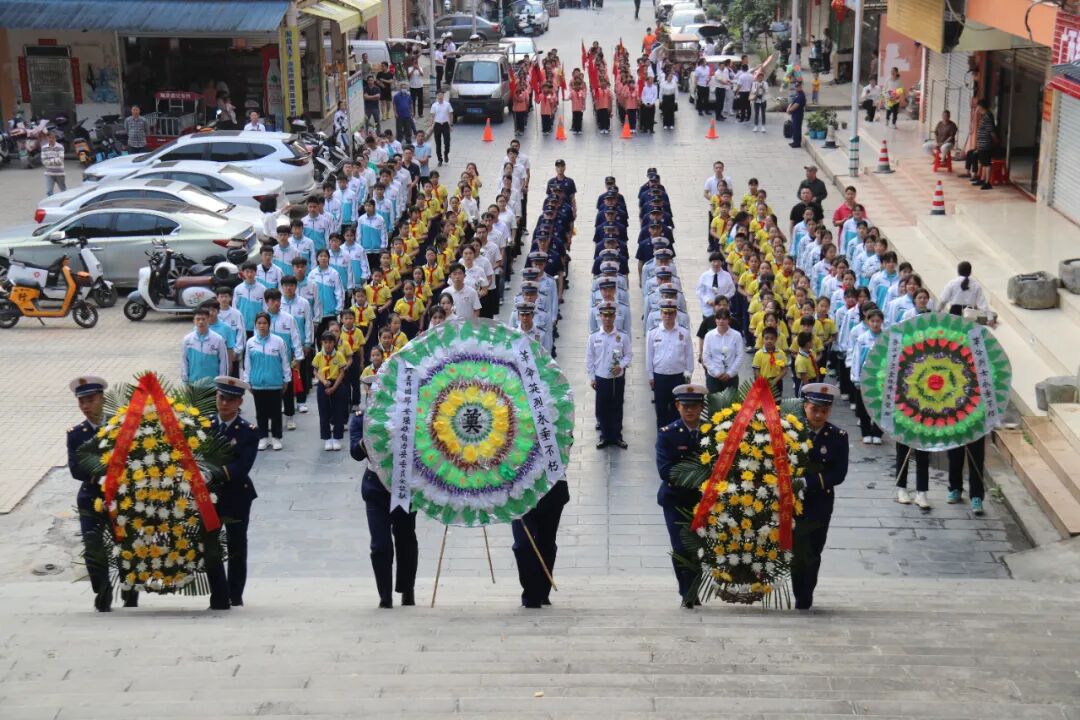 在庄严的国歌声中,全体人员整齐列队,肃立默哀。镇党委、政府、人大代表以及学生代表向烈士敬献花圈。