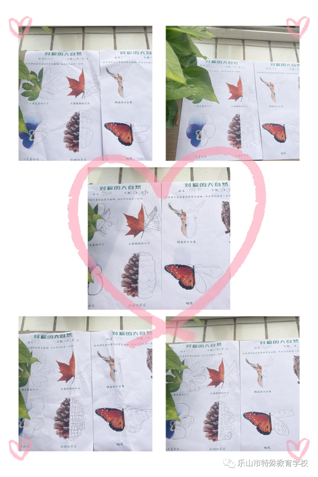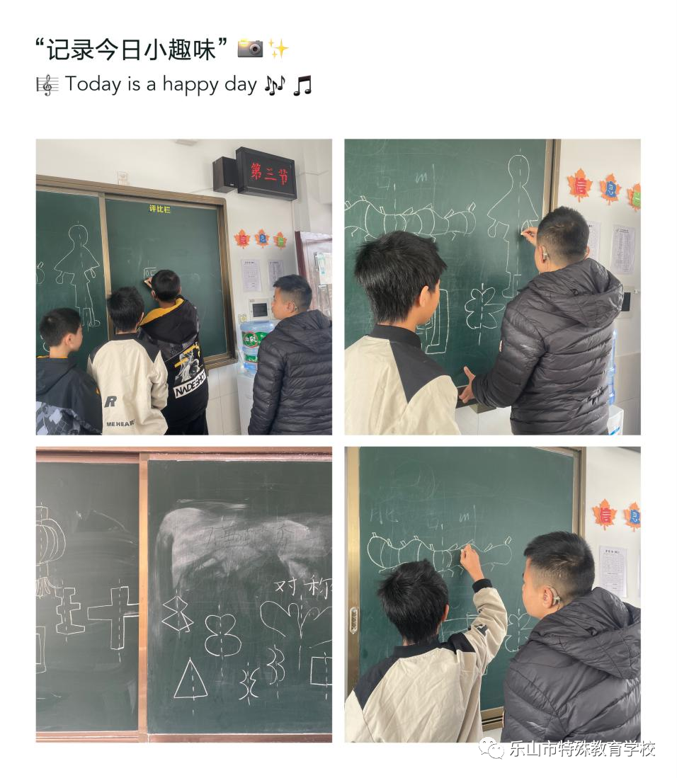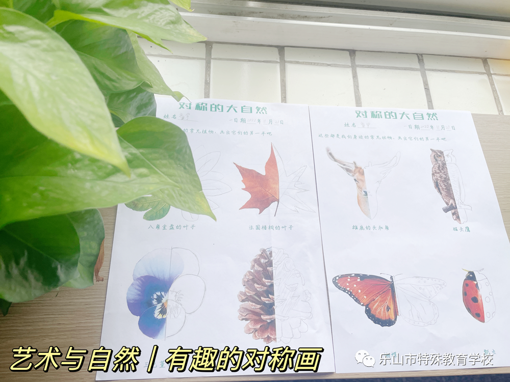 因此为了让学生在比较和欣赏中学会理解什么是对称。王老师在聋五年级开展了艺术与自然活动《有趣的对称画》,通过“找、比、画、评”的环节,引导学生发现“对称”,不仅锻炼了学生的绘画水平,提高学生的视知觉空间能力、识别能力、视觉记忆和视觉广度,更重要的是激发了他们的创作热情和勇气。
