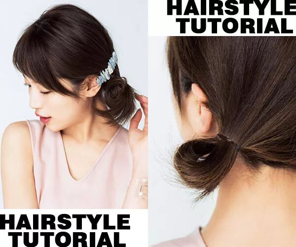 step 1:将中长发全部集中到左侧,对折扎成小发髻。